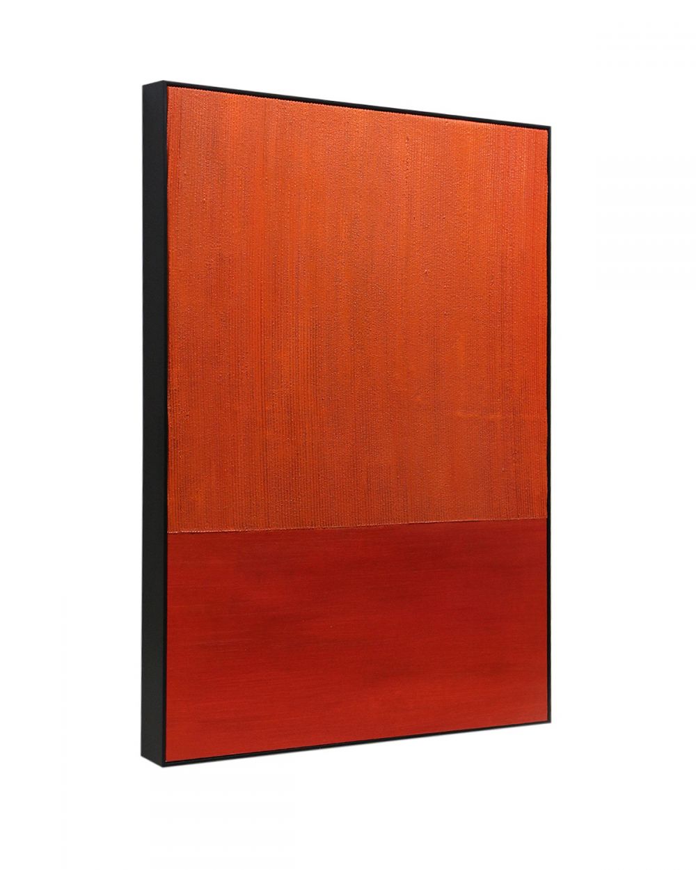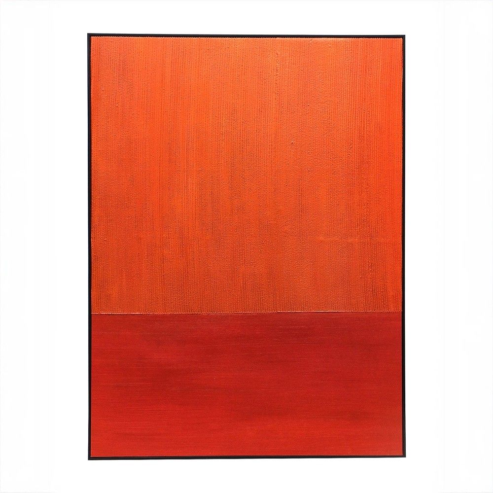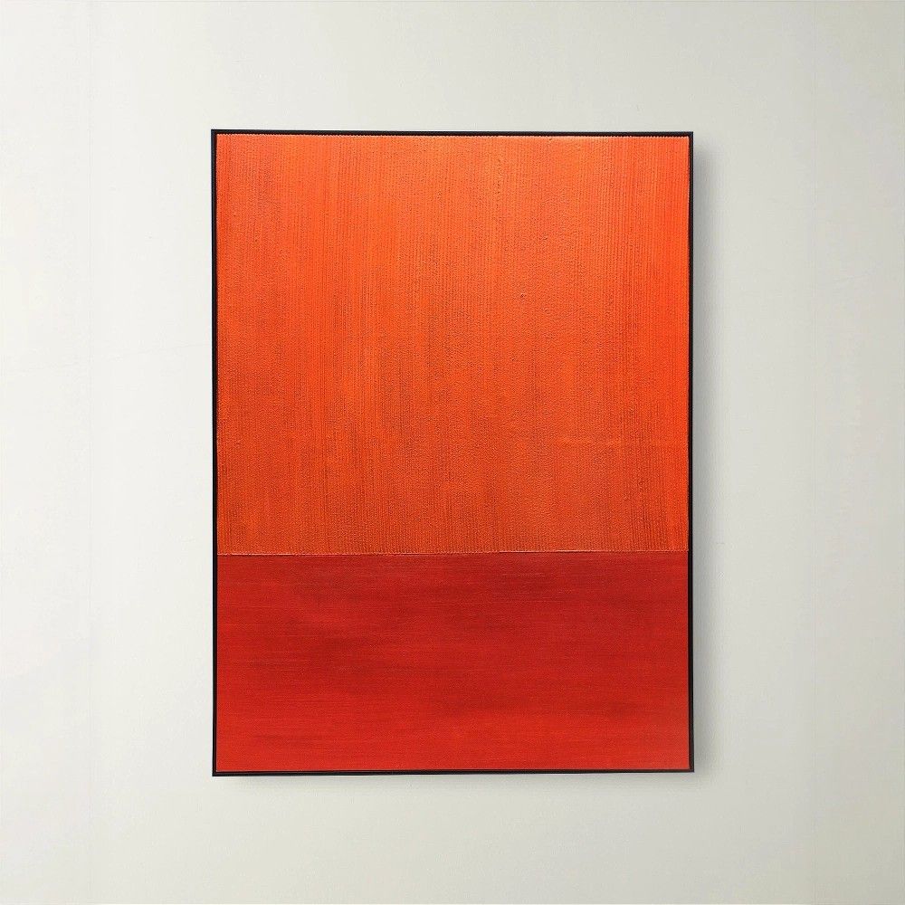 Произведение выполнено в двух основных цветах – красном и оранжевом. Эти теплые, энергичные тона добавляют композиции яркости и динамичности, но при этом, благодаря минималистичной подаче, сохраняют спокойную и медитативную атмосферу. Контраст горячего цвета и холодной, отстраненной формы создает уникальное напряжение. Черная рама подчеркивает графичность и завершает образ. Размер 100×75 см делает картину заметным, но не подавляющим акцентом. Это не просто картина, а фрагмент истории искусства, приглашение к размышлению.