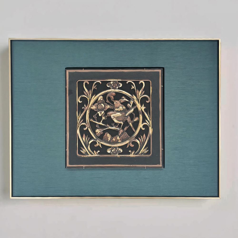 Панно с резьбой по дереву «Катай» воплощает эту эстетику с редкой красотой. В центре композиции – изящное рельефное изображение двух птиц, выполненных резьбой по дереву с добавлением золочения. Каждое перышко, каждый изгиб ветки проработаны с невероятной точностью, что делает панно поистине уникальным. Птицы изображены на фоне стилизованных растительных мотивов, заключенных в круглую рамку, что создает ощущение гармонии, завершенности и символической полноты.
