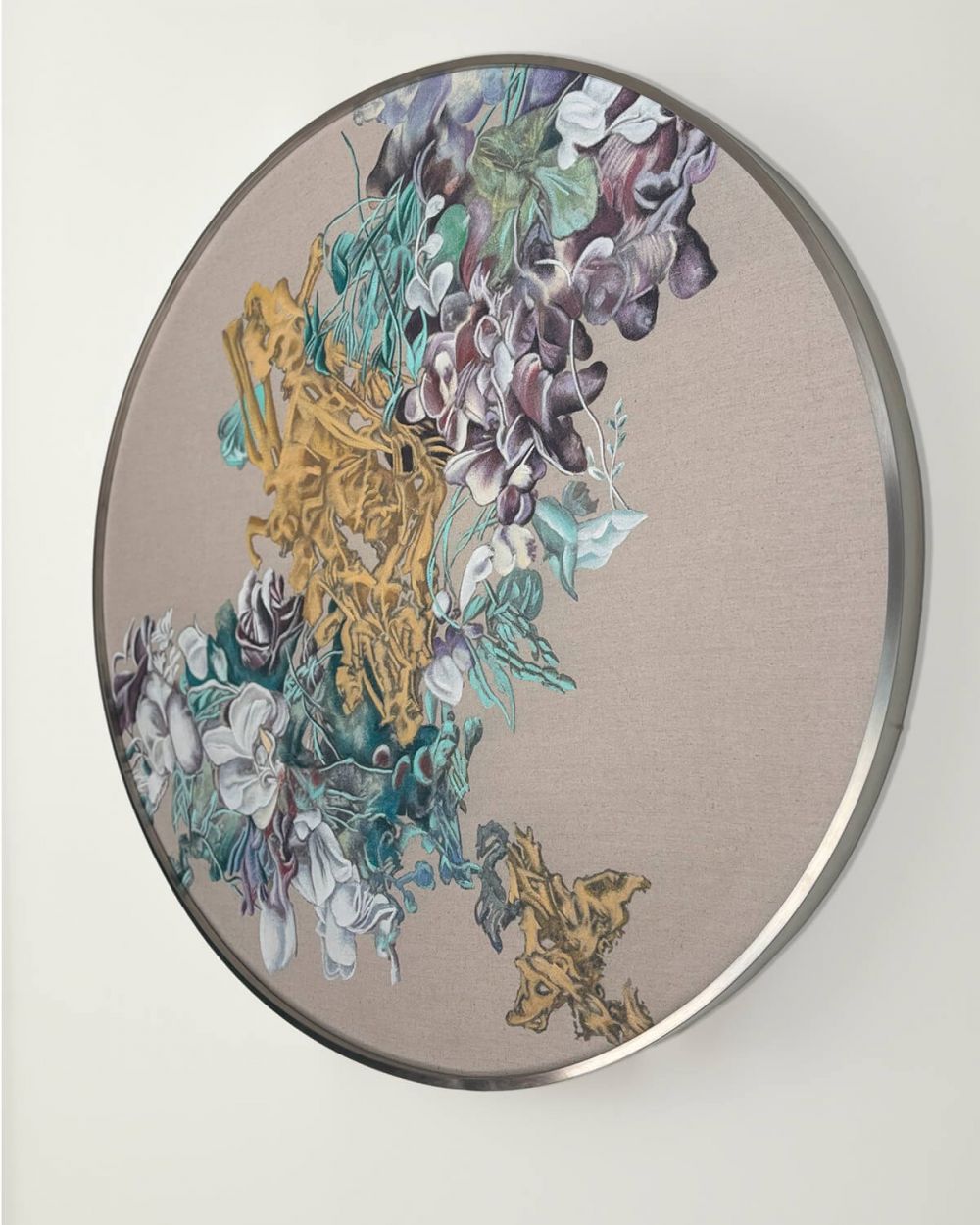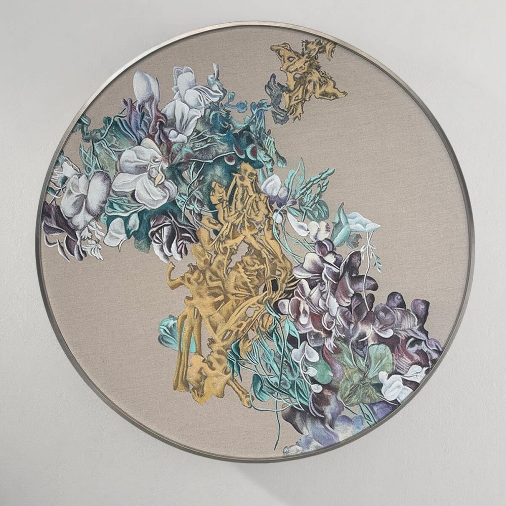 Техника гунби требует невероятного терпения и мастерства – каждая линия продумана и выверена. Натуральный льняной холст – идеальная основа для такой тонкой работы. Серебристая металлическая рама подчеркивает современность и не перетягивает внимание. Круглая форма позволяет экспериментировать с размещением. Легкий вес (2,6 кг) упрощает монтаж.