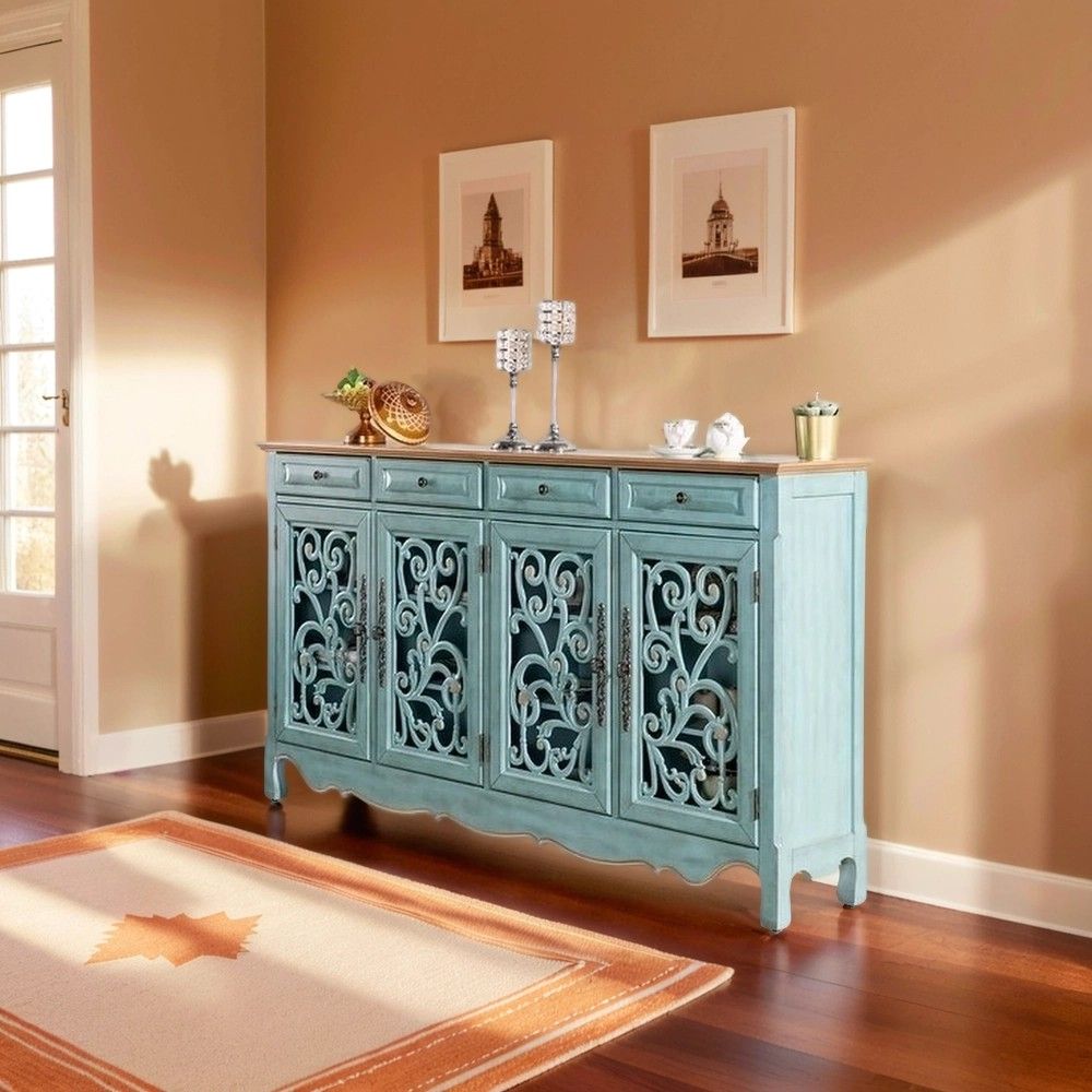 * **Выразительные резные фасады:** Четыре дверцы с ажурной резьбой — главный акцент, создающий игру света и тени, объем и изысканную фактурность.