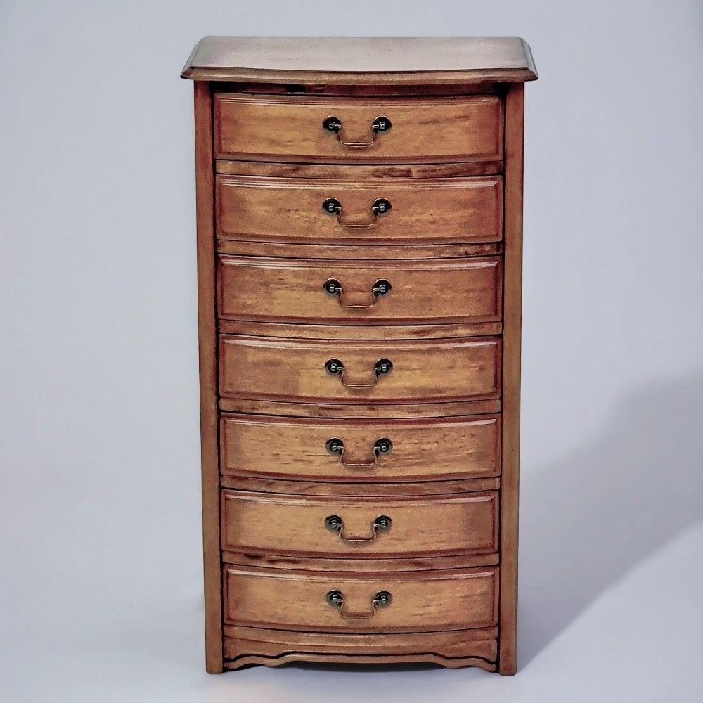 Этот комод с семью выдвижными ящиками создан для тех, кто ценит каждый сантиметр пространства. При ширине всего 52,5 см и глубине 36 см он занимает не больше места, чем небольшой стул, но благодаря высоте 95 см и семи ящикам предоставляет массу места для хранения. В нем легко поместятся вещи всех членов семьи: от носков и белья до документов и аксессуаров.