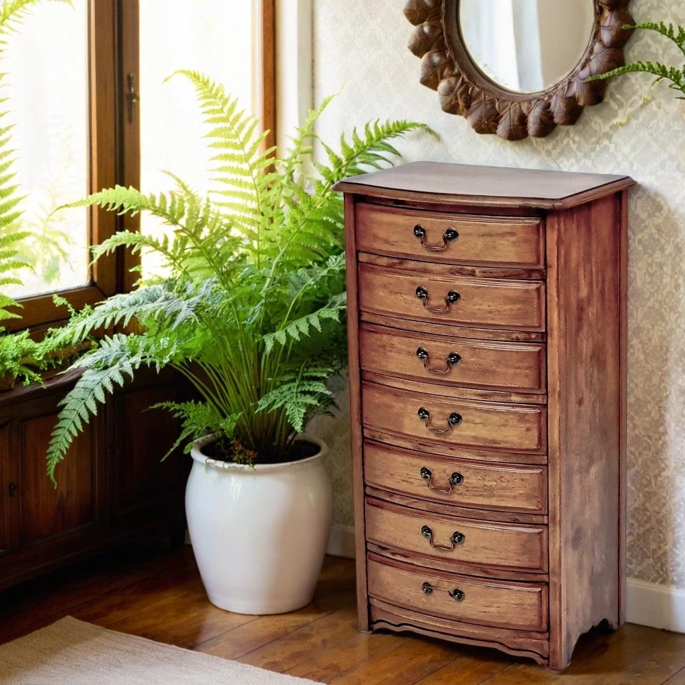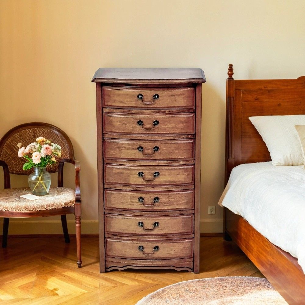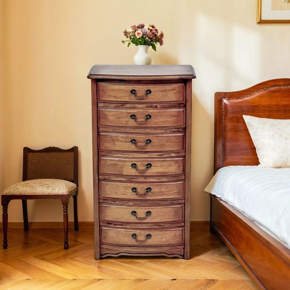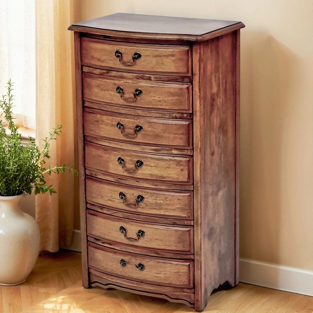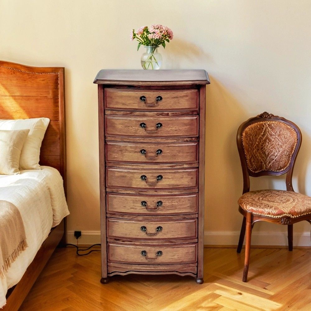 Эффект старения достигается путем нанесения патины и искусственного состаривания, что подчеркивает текстуру дерева. Семь ящиков разного размера позволяют гибко организовать хранение. Компактная глубина 36 см делает комод идеальным для узких пространств. Вес 22 кг говорит о качественных материалах. Поставляется в одной коробке в разобранном виде.