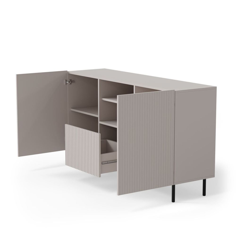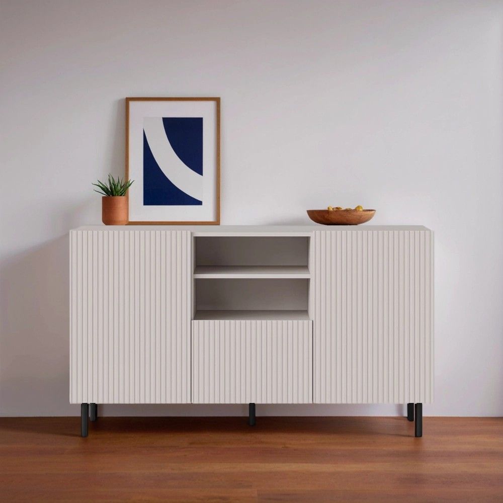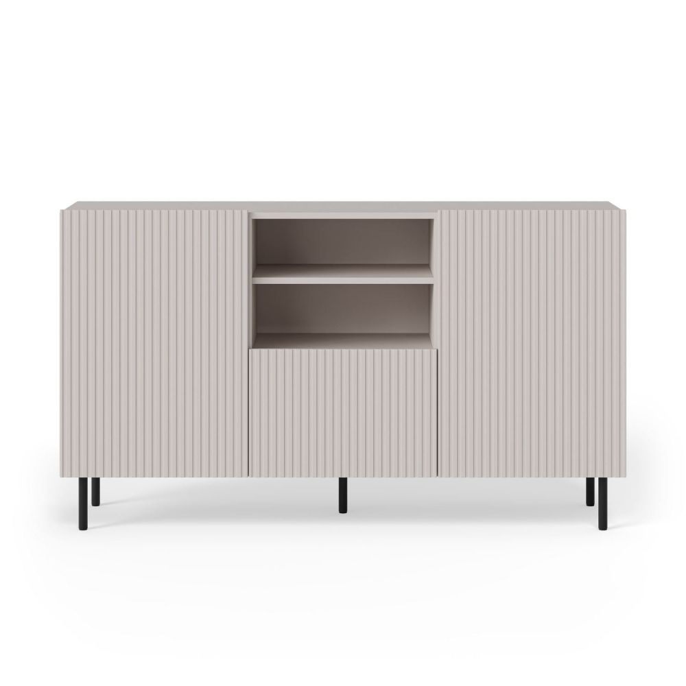 Фасады комода украшены характерными канавками, придающими мебели современный и утонченный вид. Изготовленный из ламинированного мебельного щита, фольгированного МДФ и стали с порошковым покрытием, комод обеспечивает долговечность и простоту ухода.