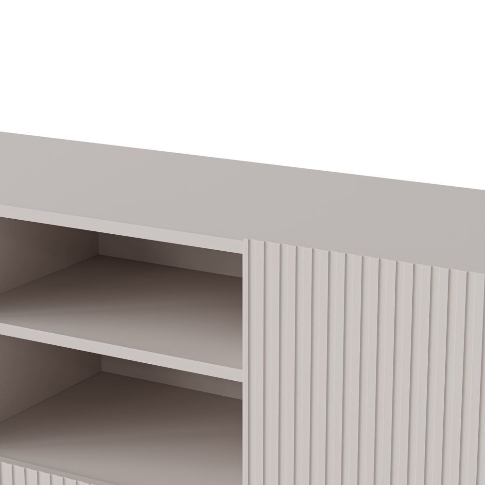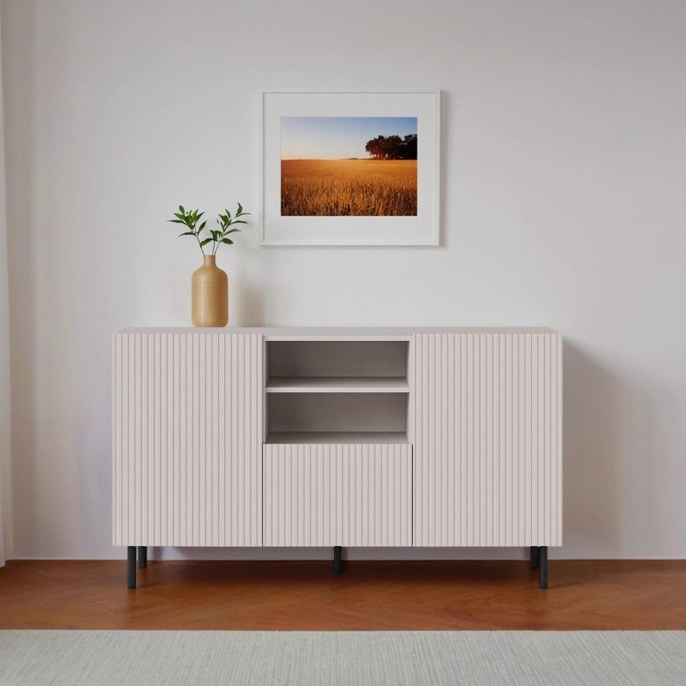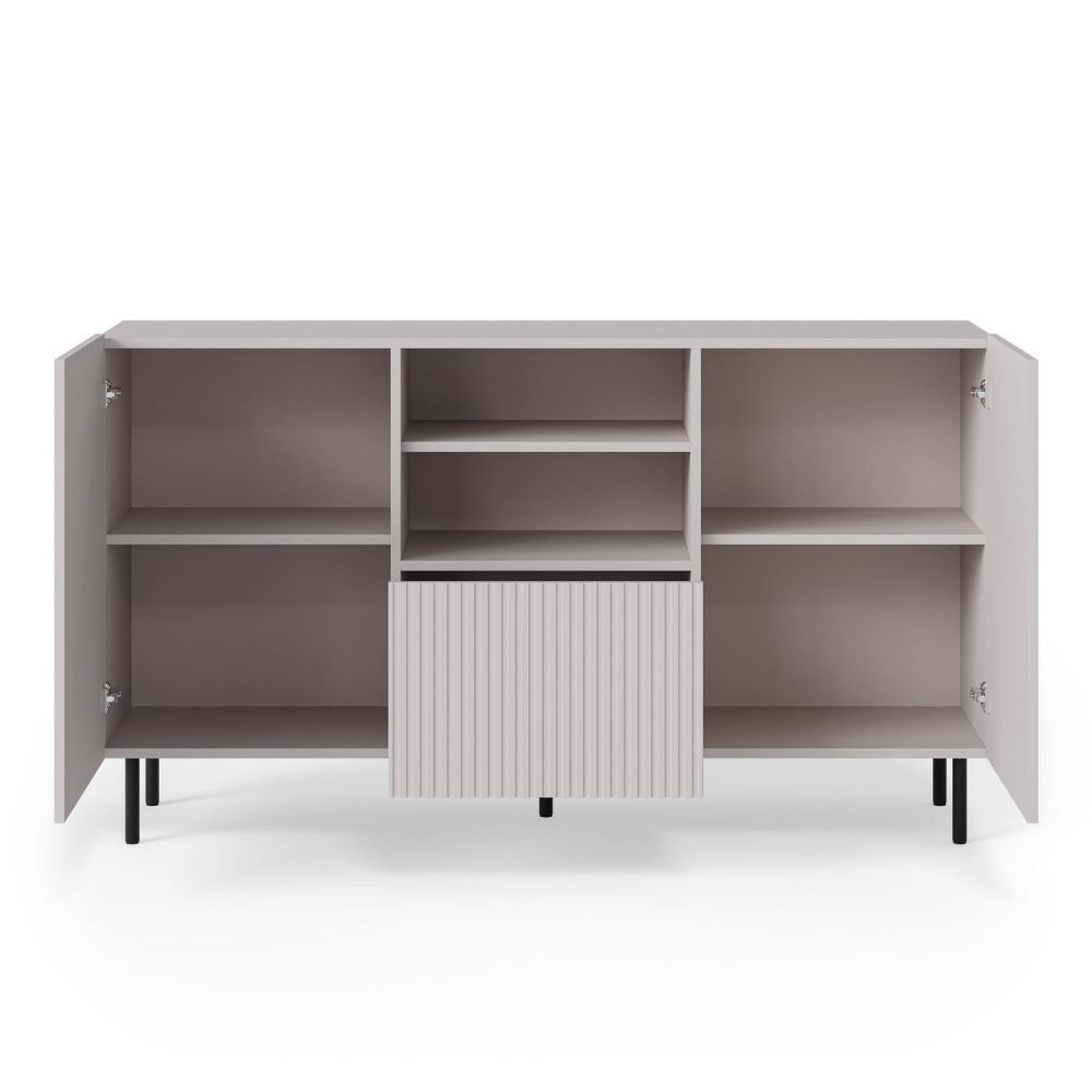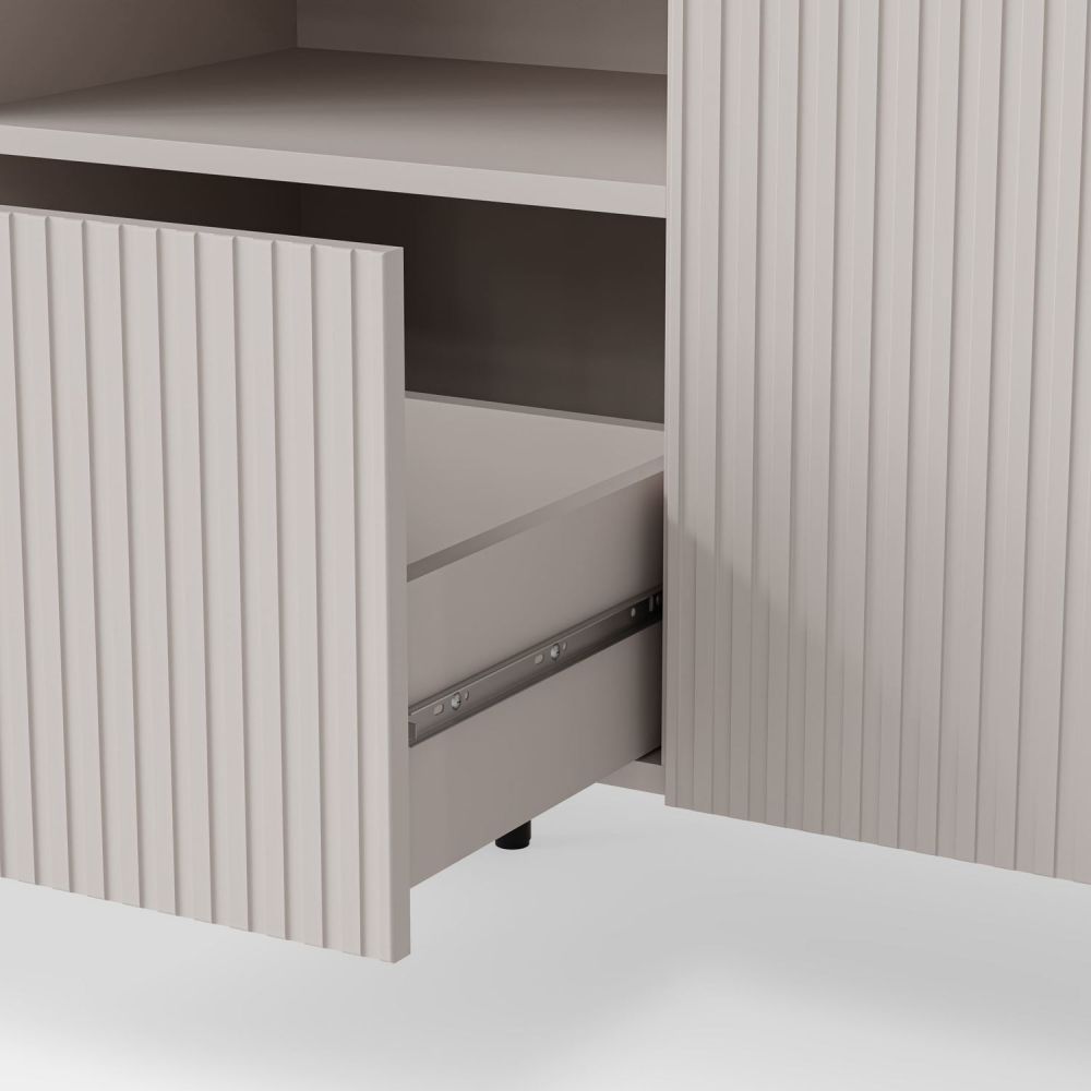 Фасады комода украшены характерными канавками, придающими мебели современный и утонченный вид. Изготовленный из ламинированного мебельного щита, фольгированного МДФ и стали с порошковым покрытием, комод обеспечивает долговечность и простоту ухода.