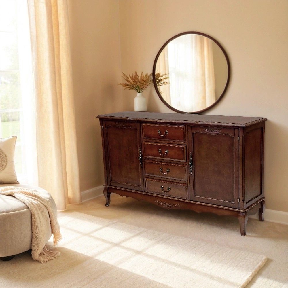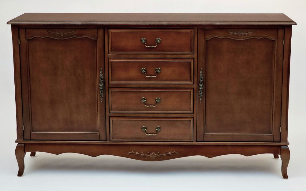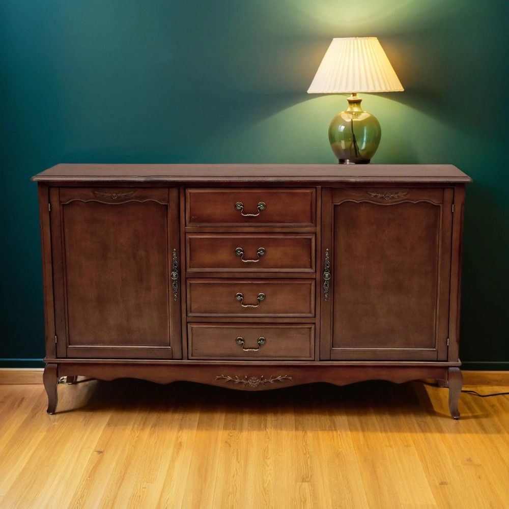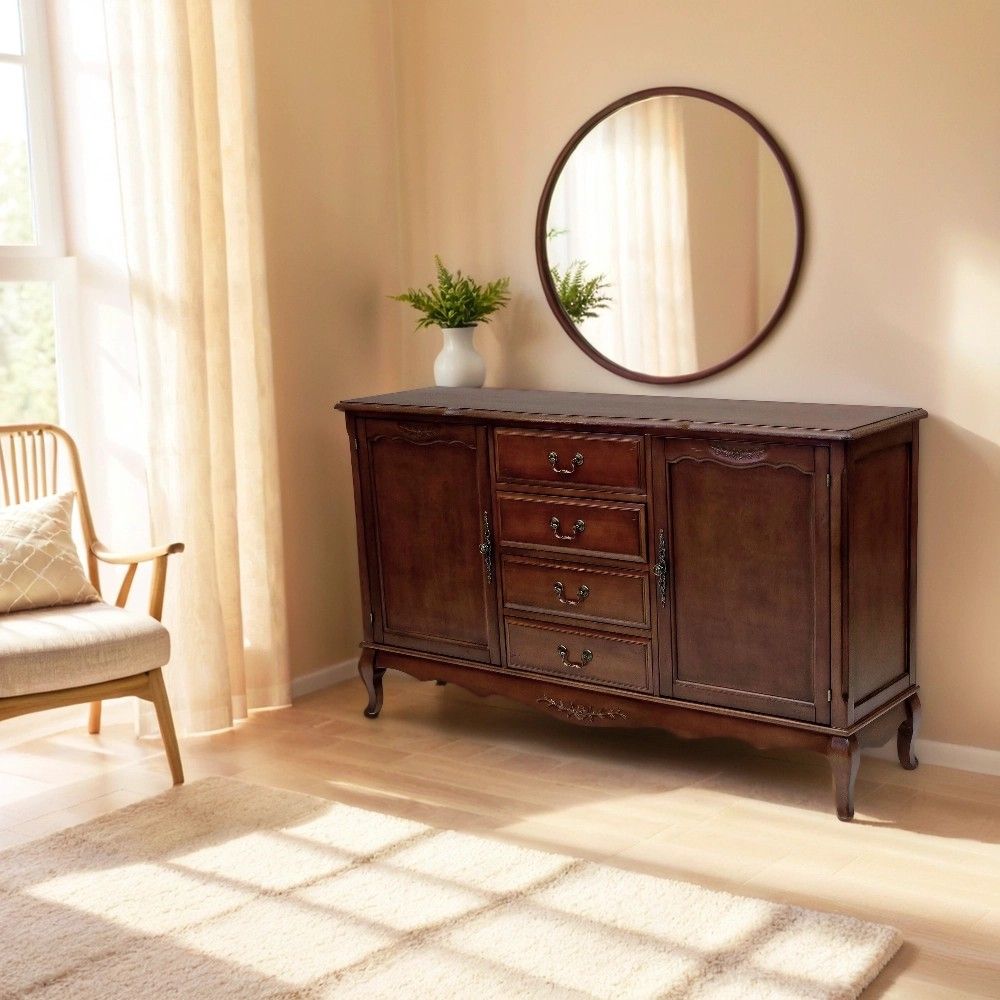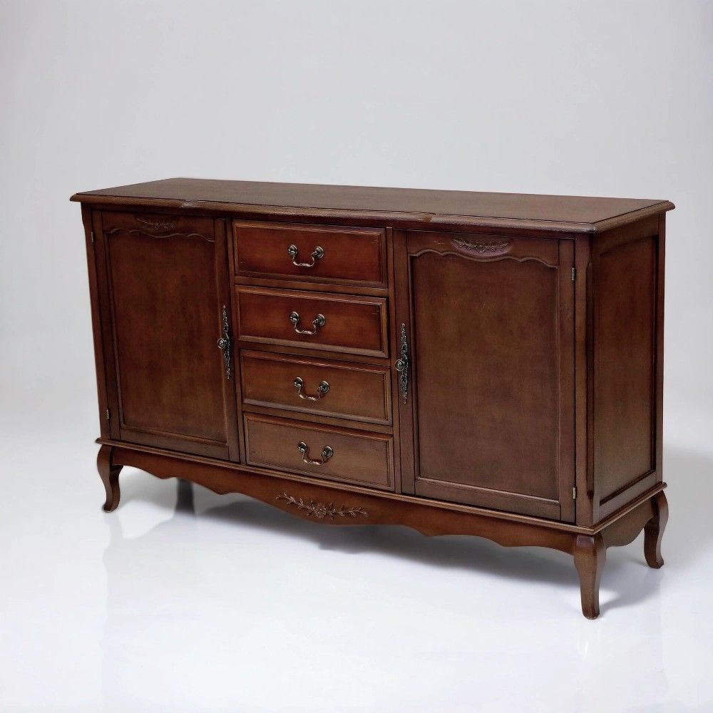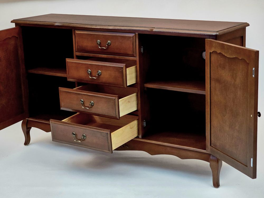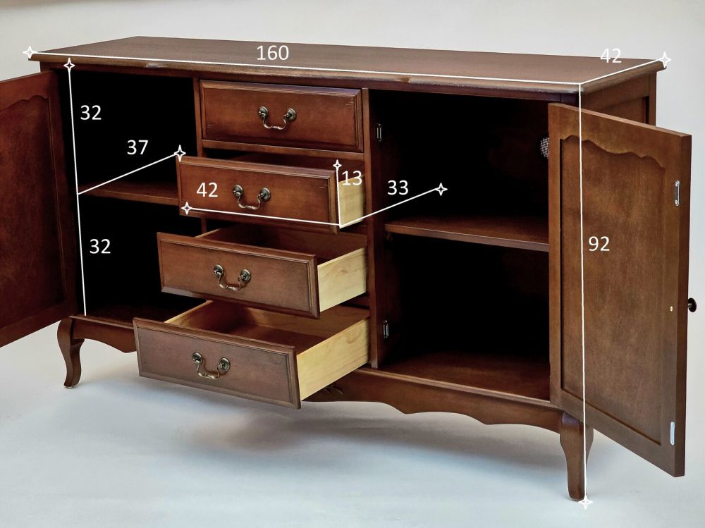 Этот комод в традиционном стиле создан для тех, кто ценит продуманную организацию пространства. Его конструкция идеально сбалансирована: центральная часть с четырьмя выдвижными ящиками предназначена для хранения мелких и средних предметов, которые должны быть всегда под рукой. Боковые секции, закрытые распашными дверями, идеально подходят для более крупных и объемных вещей – пледов, подушек, одежды или посуды.