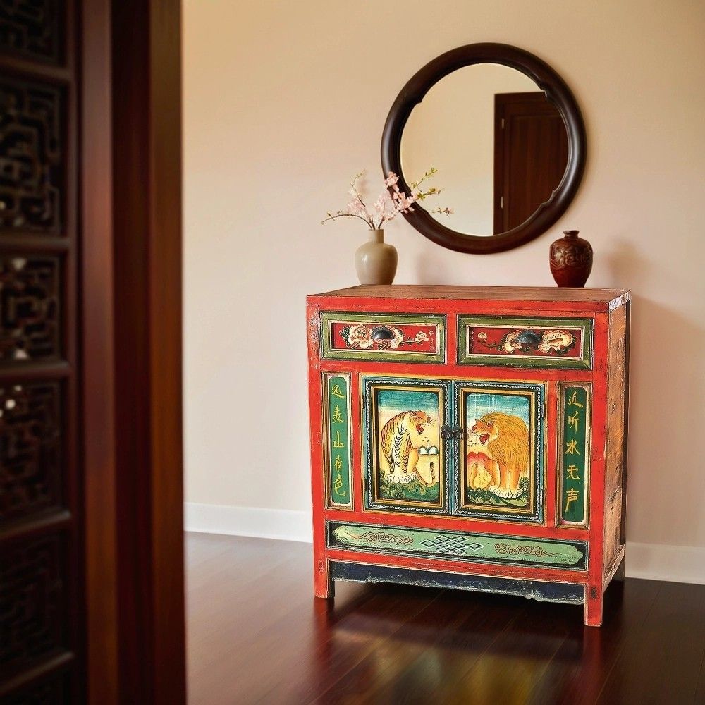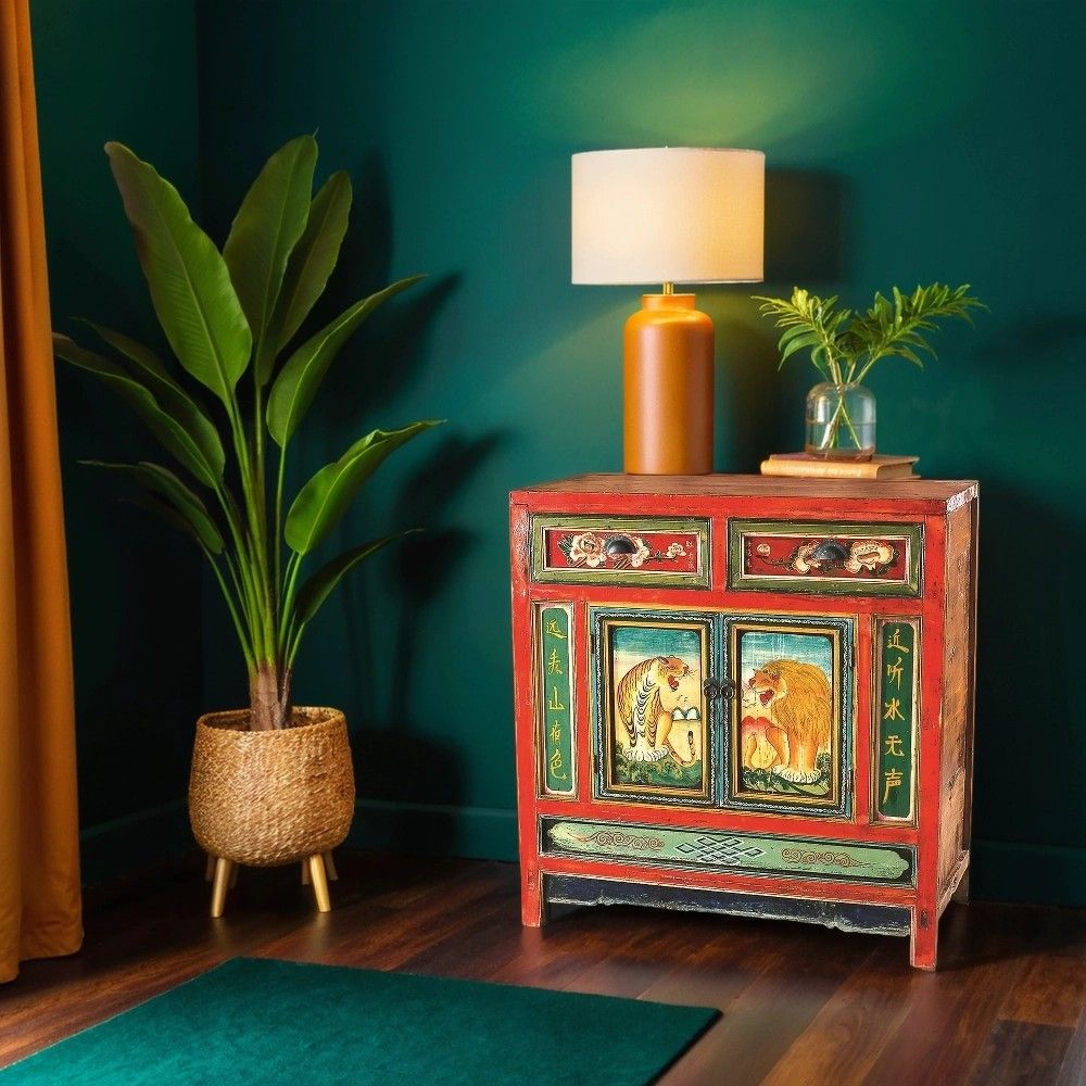 Этот комод — не просто система хранения, а полноценная картина, воплощенная на поверхности из массива дерева. Драматичный сюжет с противоборством льва и тигра, дополненный нежными цветочными мотивами на ящиках, создает уникальный художественный образ. Каждый мазок подчеркивает статус владельца, ценящего исключительность и ручной труд.