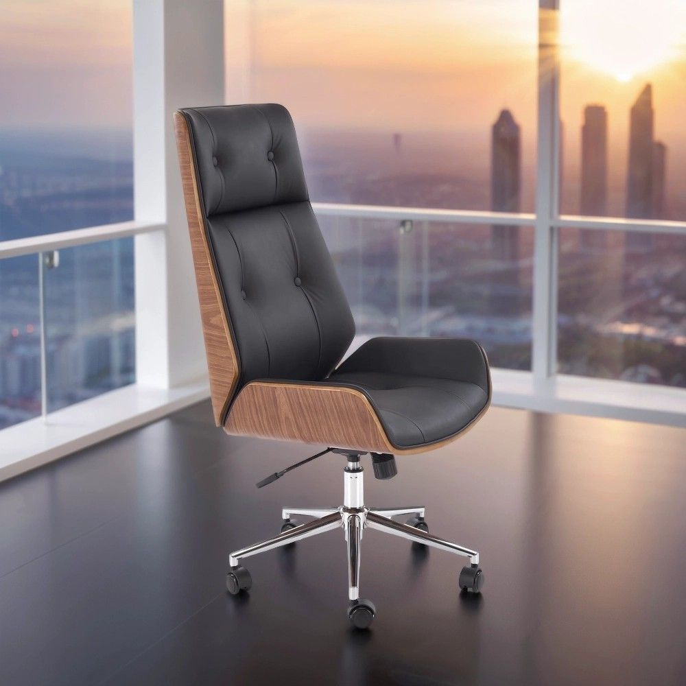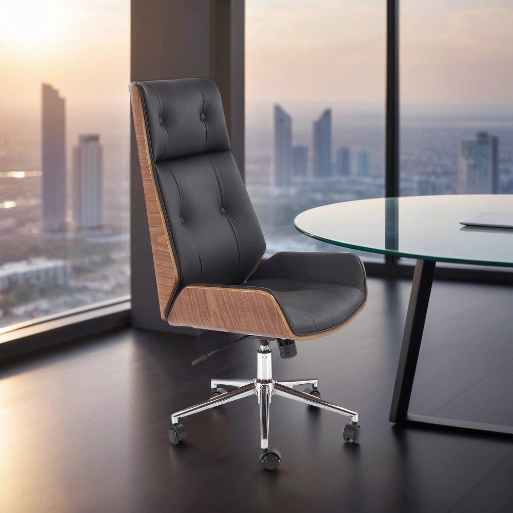 Кресло изготовлено из гнутой фанеры и экокожи, что придаёт ему элегантный и современный вид. Цветовая комбинация ореха и черного добавляет изысканности, делая кресло идеальным выбором для любого интерьера.