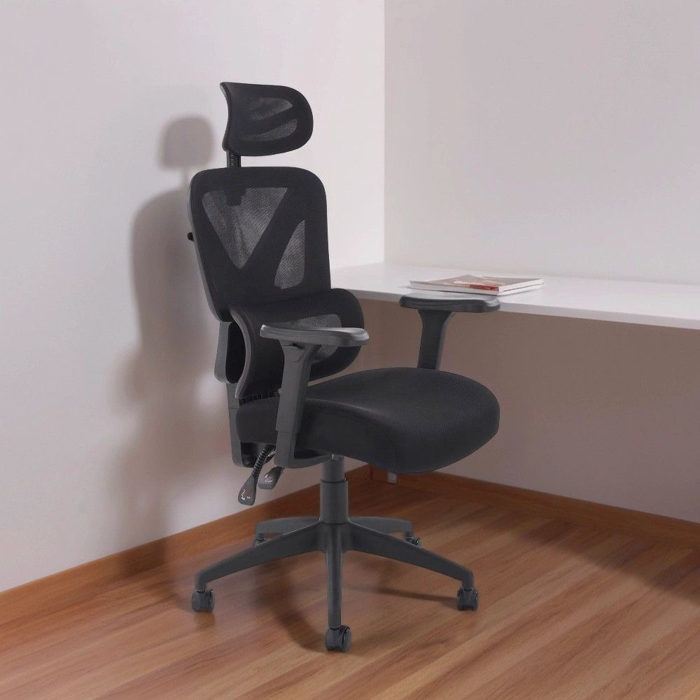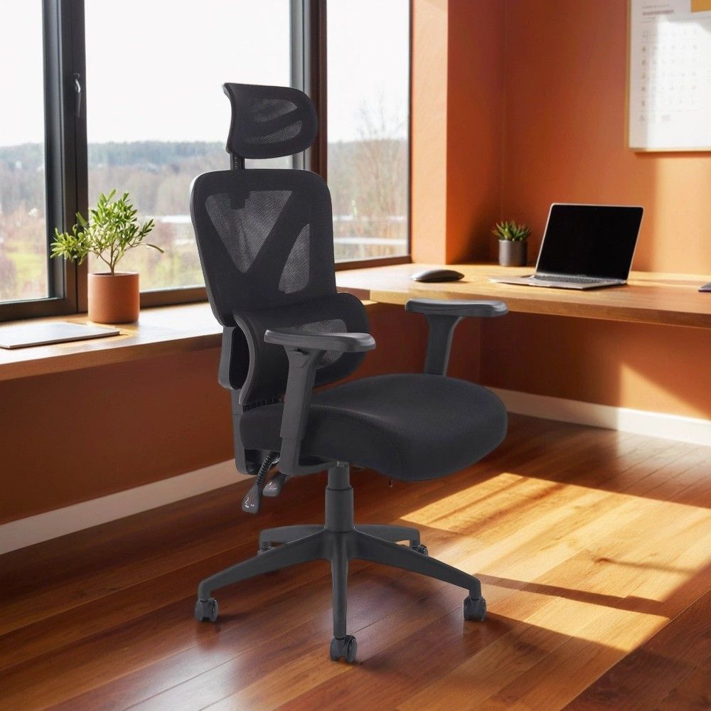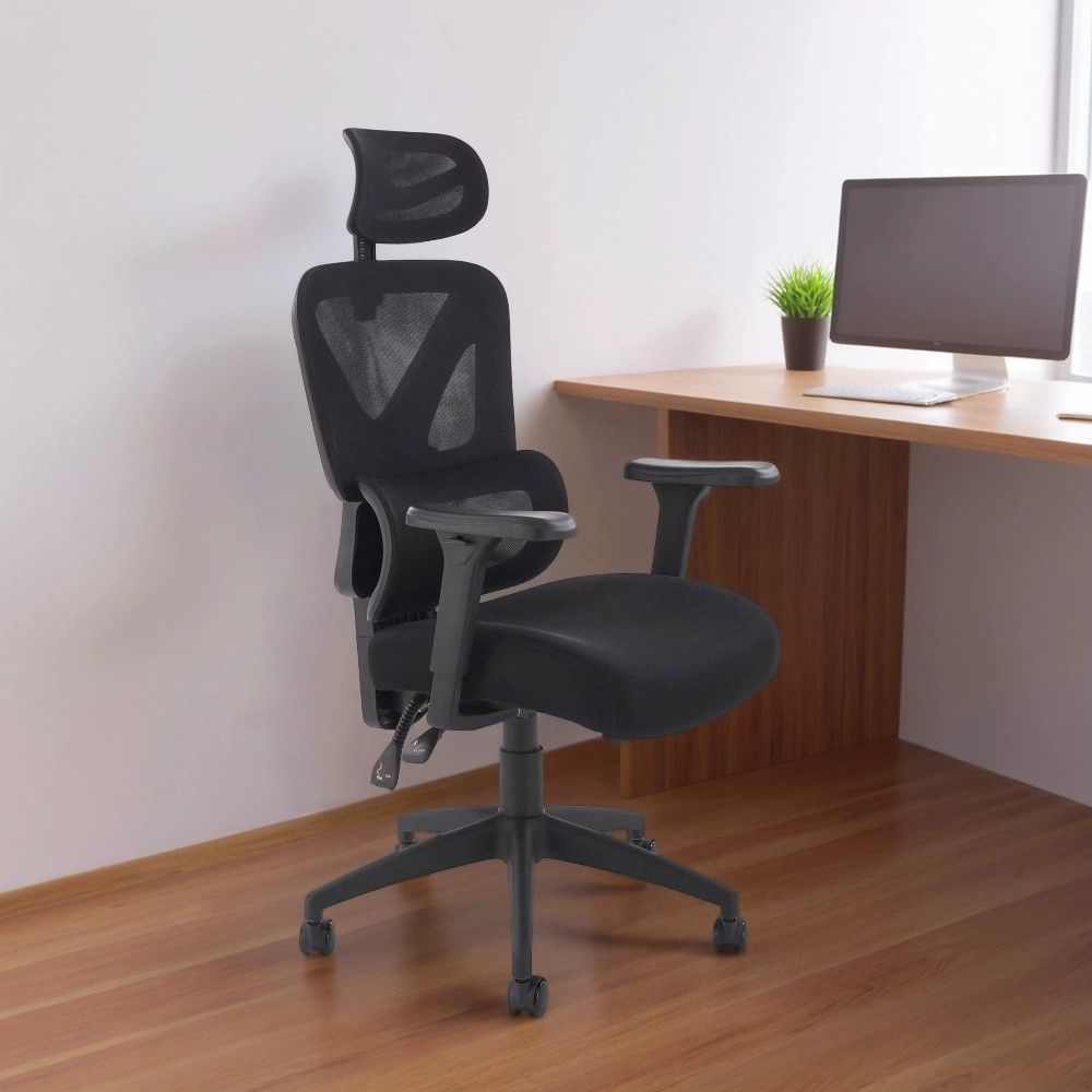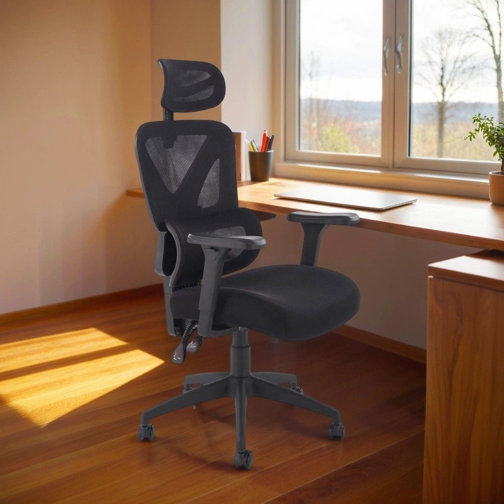 Кресло имеет регулируемые подлокотники, подголовник и спинку, что позволяет настроить его под индивидуальные потребности. Изготовленное из сетки, кресло обеспечивает отличную вентиляцию и удобство, делая его идеальным выбором для длительной работы.