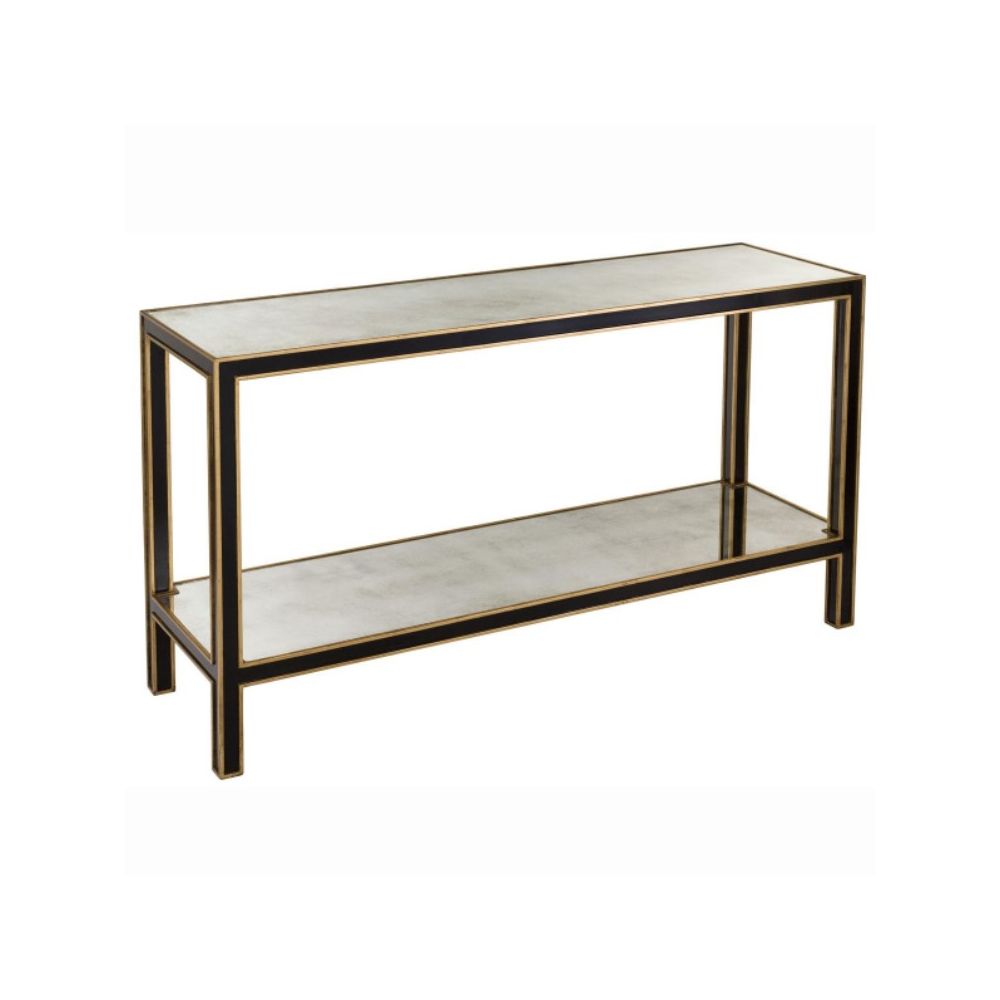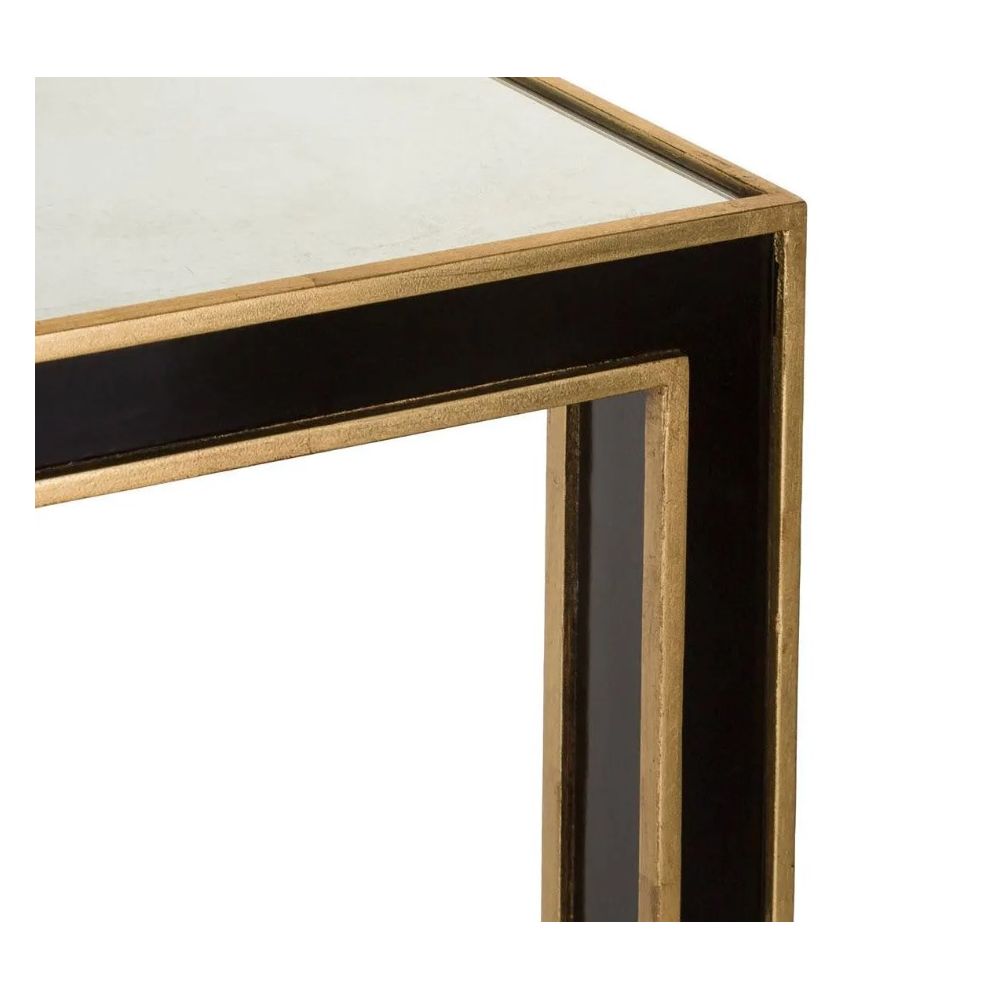 Чёрная консоль “Камбрия” — воплощение утончённой элегантности и тонкого вкуса. Глубокий оттенок чёрного окрашенного дерева подчёркнут изящной золотой окантовкой, а зеркальная столешница придаёт композиции лёгкость и благородное сияние. Четыре прямые ножки соединены полкой из состаренного зеркала, добавляя конструкции архитектурную завершённость и винтажный характер. “Камбрия” станет выразительным акцентом в гостиной и удобным решением для открытого хранения декоративных предметов, книг и аксессуаров.