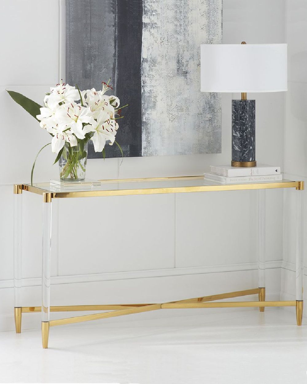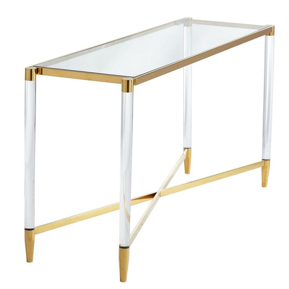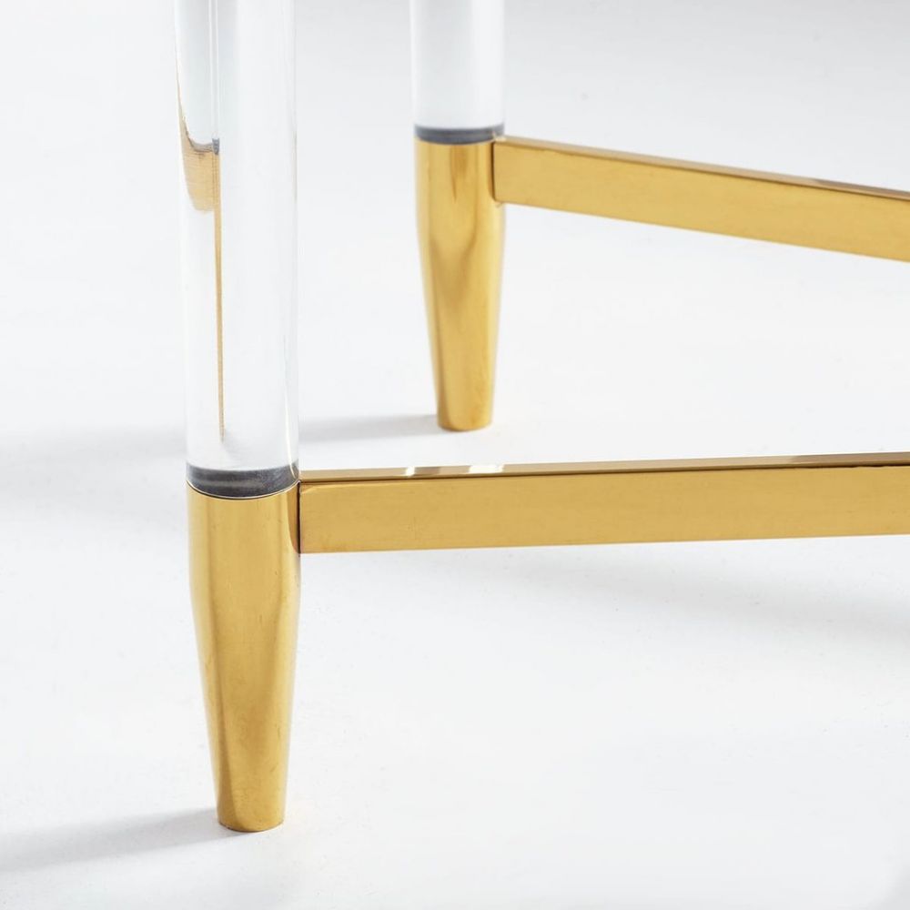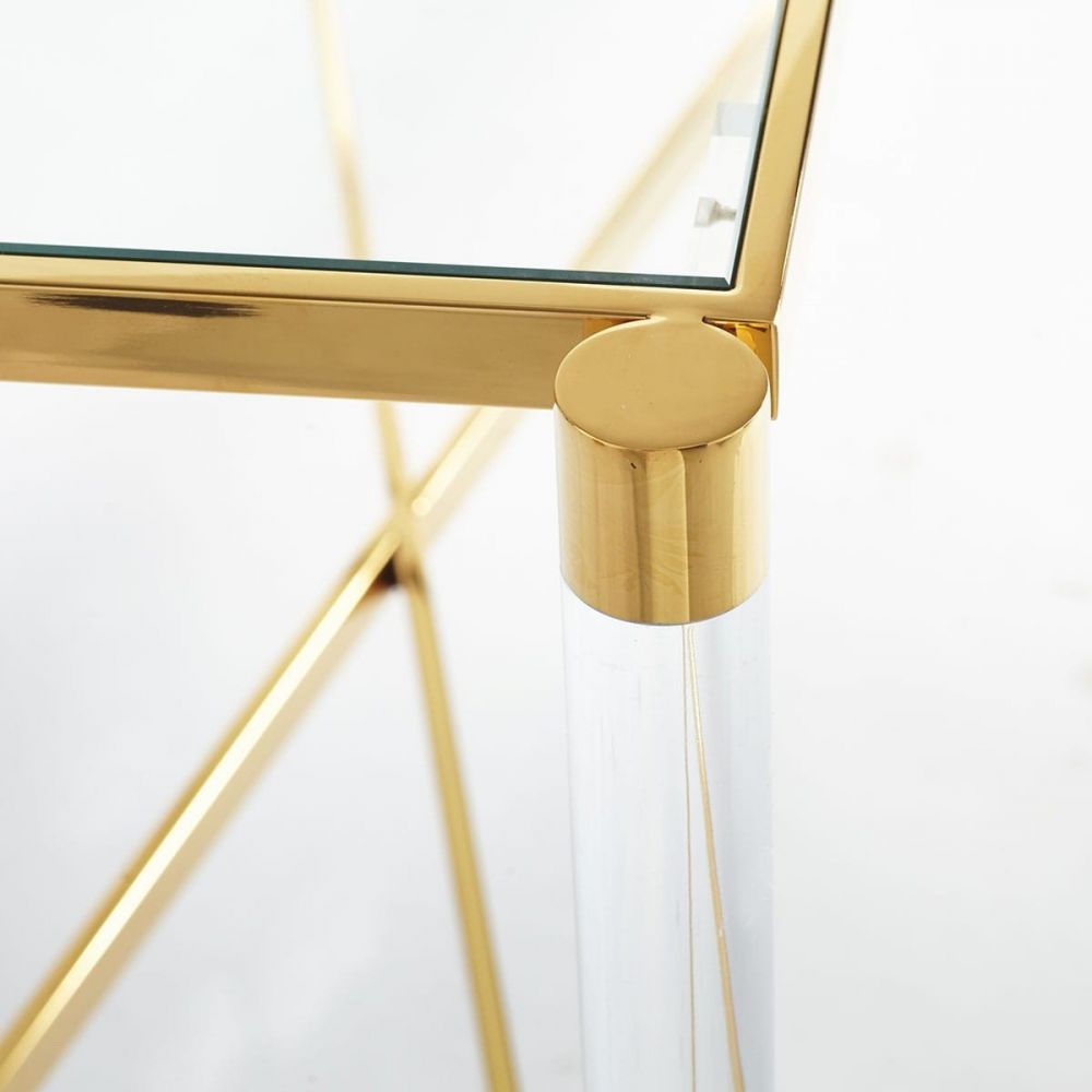 Золотая консоль “Ясмин” — это элегантное сочетание прочности и воздушности. Прямоугольная форма и закалённое стекло в качестве столешницы создают лёгкость и современный стиль. Металлическая каёмка из нержавеющей стали, выполненная в полированном золотистом оттенке, обрамляет столешницу и нижнюю часть ножек, придавая изделию изысканность и роскошный вид. Эта консоль идеально впишется в интерьер, добавив ему шарма, а в комплект можно добавить кофейный и журнальный столики из той же коллекции для завершённого образа.