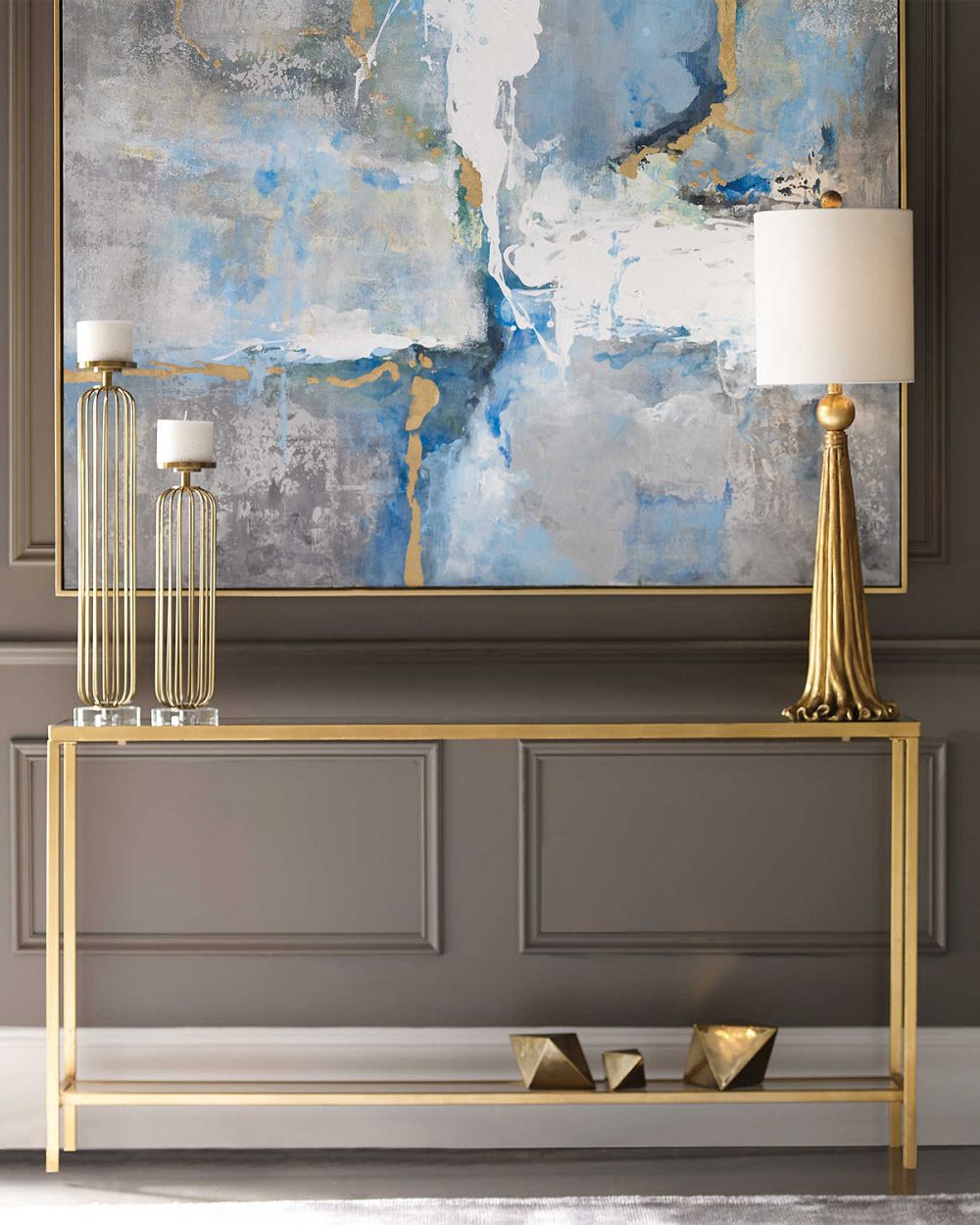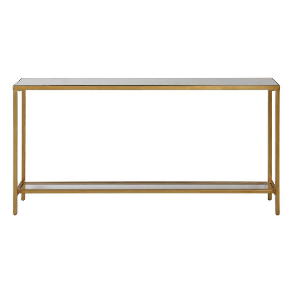 Золотая консоль “Уитман” — воплощение классического минимализма с современным акцентом. Золотистый цвет и прямоугольная форма придают изделию строгий, но стильный вид, а зеркальная столешница широкой площади добавляет свет и простору. Прочный металлический каркас и нижняя полка из прозрачного закалённого стекла создают баланс между элегантностью и функциональностью. Консоль идеально впишется в прихожую или гостиную, придавая интерьеру утончённый и дизайнерский вид.