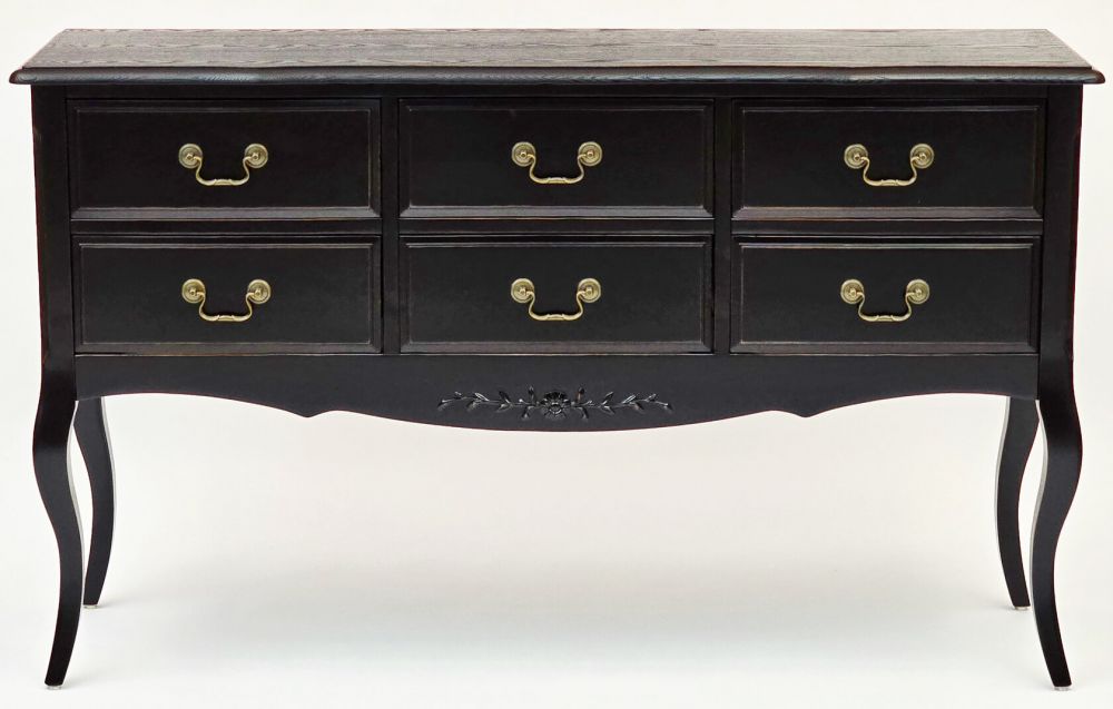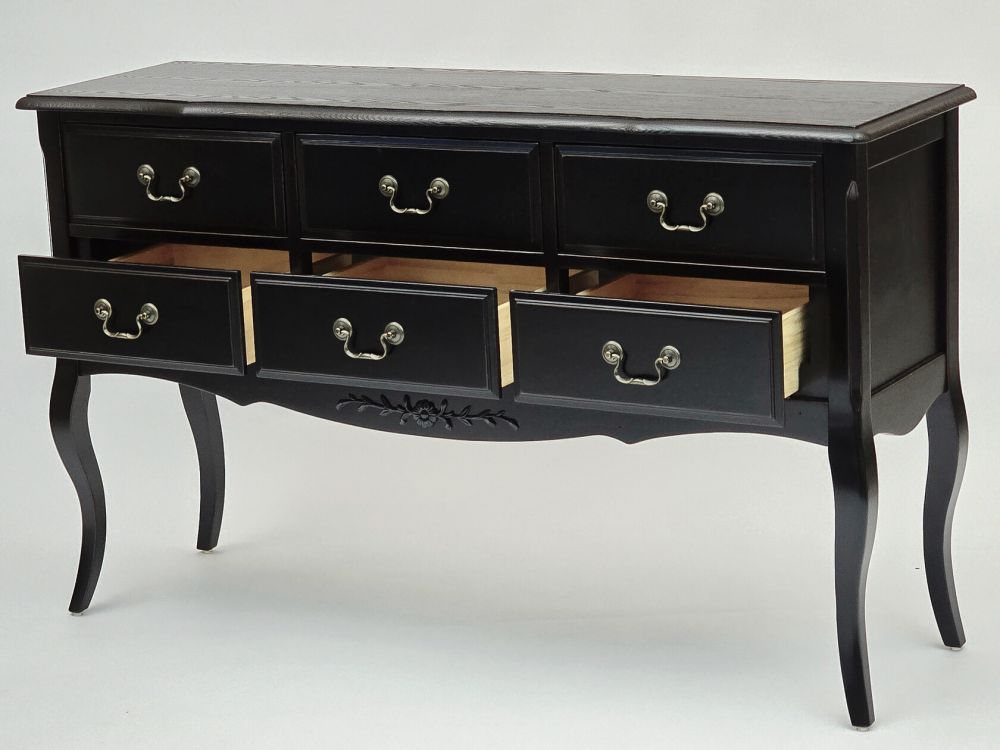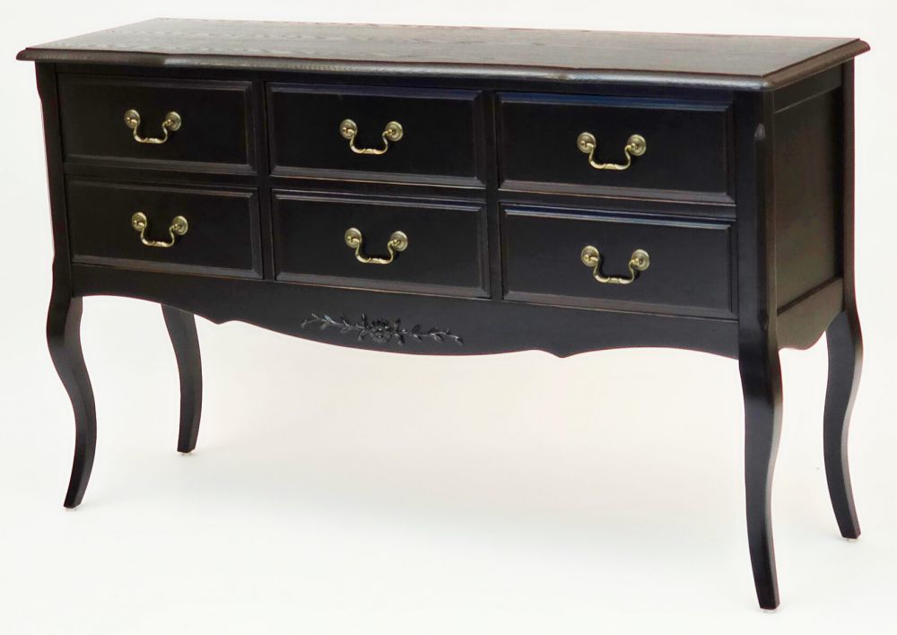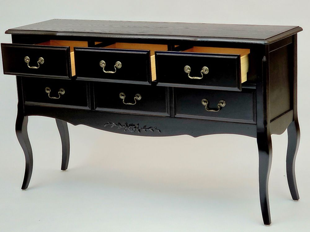 Благородный черный цвет с эффектом старения придает консоли вид ценной винтажной вещи, словно она хранит историю нескольких поколений. Размеры 134×40×80 см делают ее заметным, но не громоздким предметом – она идеально впишется в просторную прихожую, холл или гостиную. Верхняя поверхность может использоваться для декора – ваз, свечей, фоторамок. Прочная конструкция из массива дерева гарантирует долговечность.