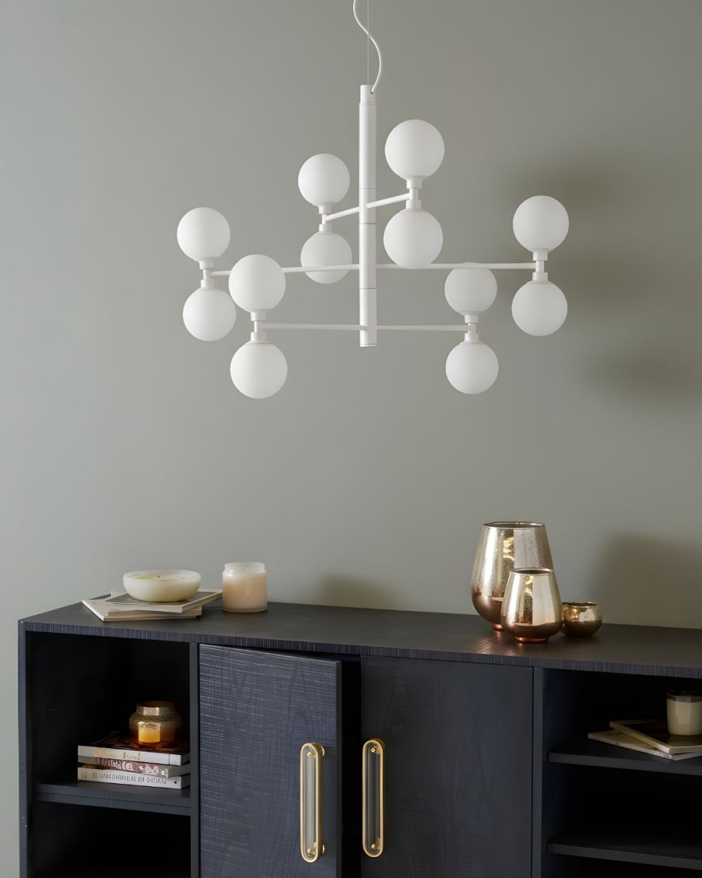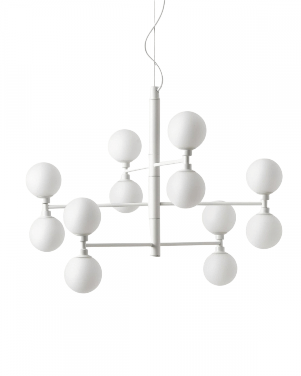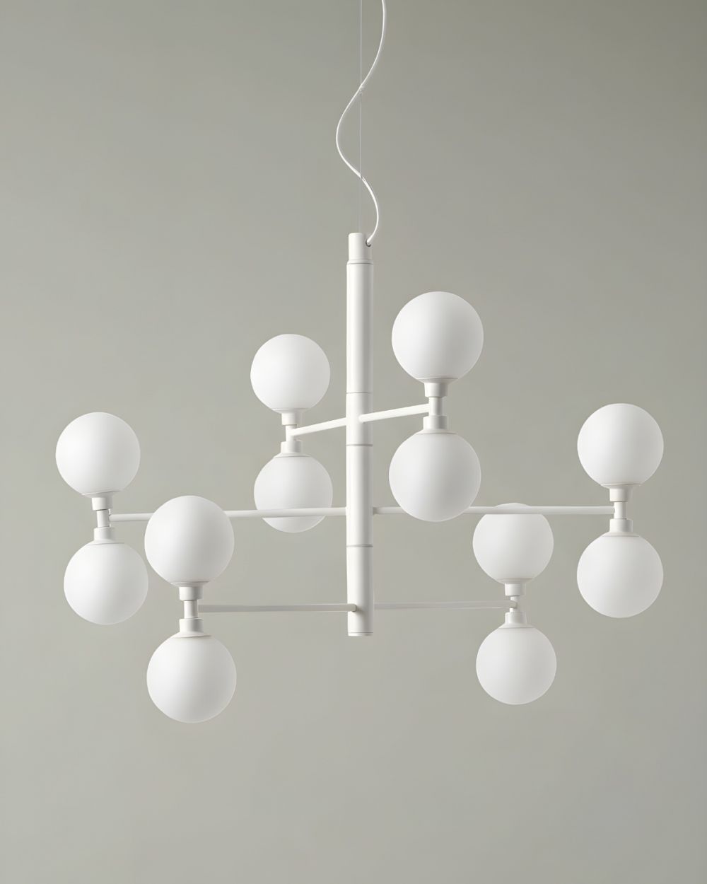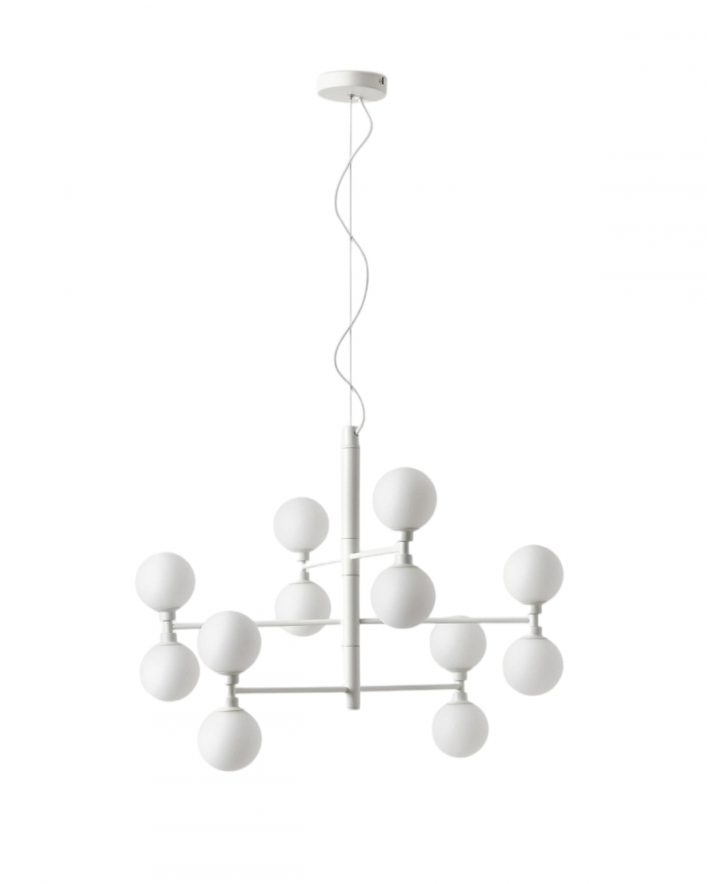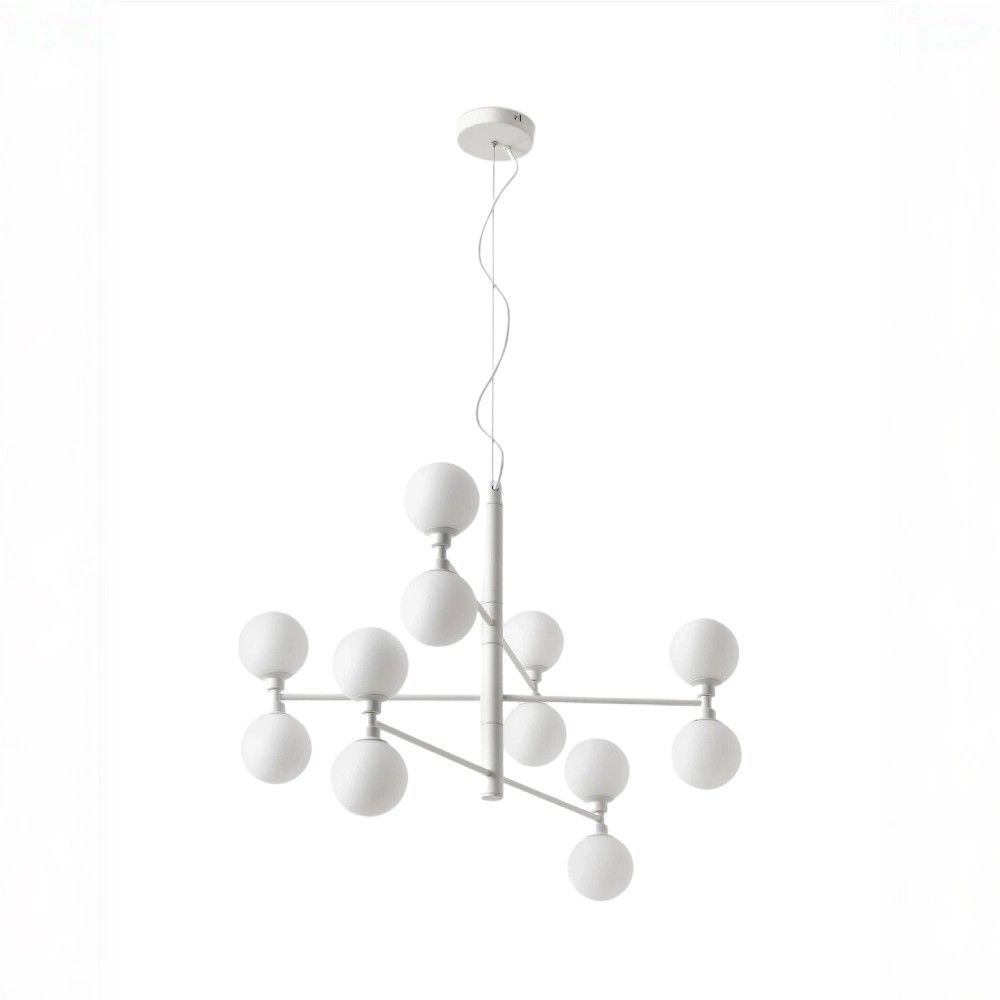 Материалы: Основание выполнено из прочного металла с идеальной матово-белой покраской, которая не желтеет со временем. Двенадцать плафонов — из матового стекла опалового оттенка. Этот дуэт создаёт современный и очень элегантный образ.