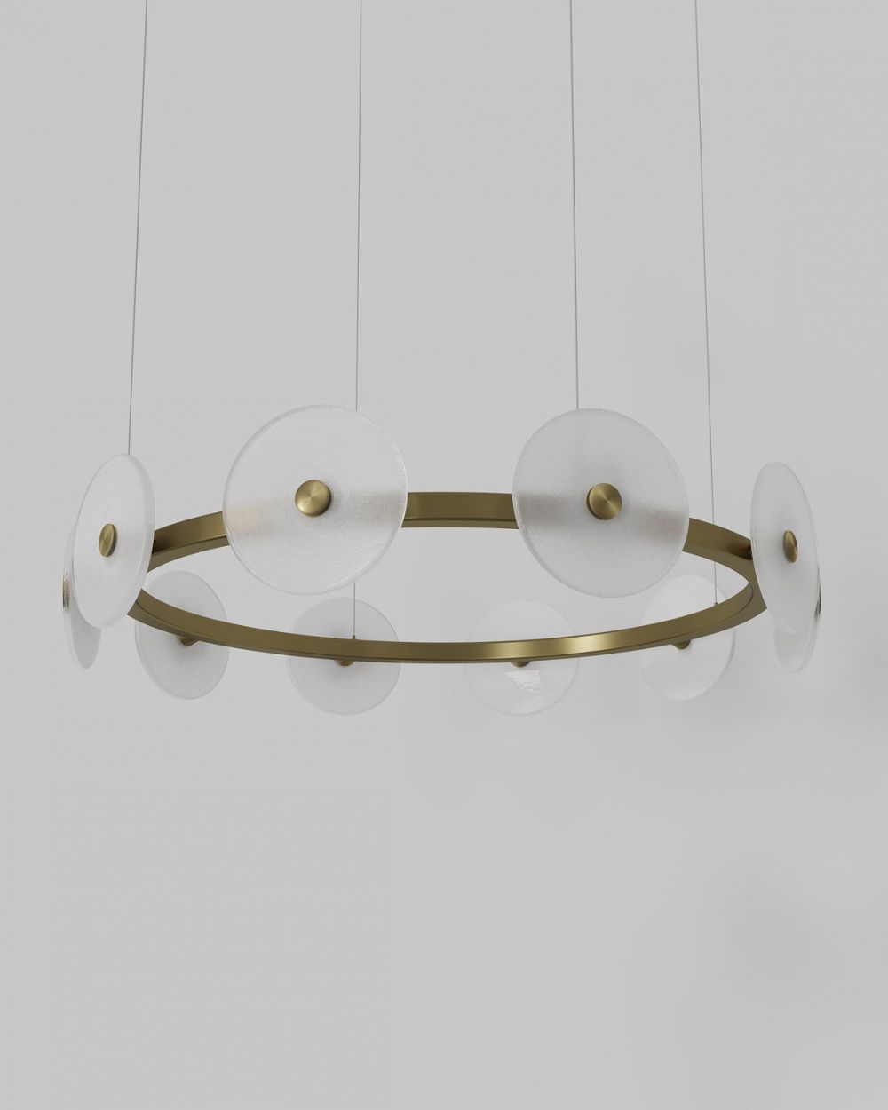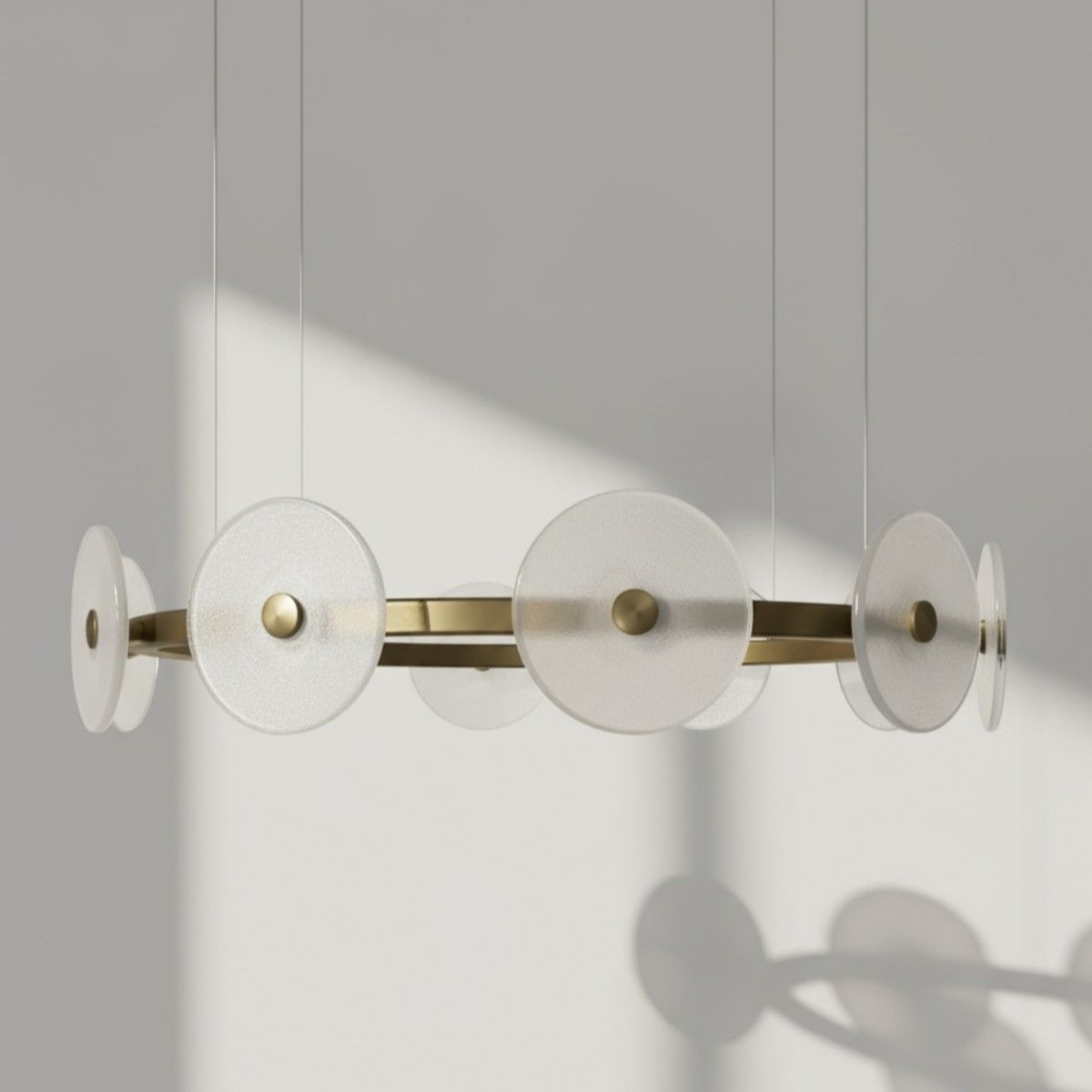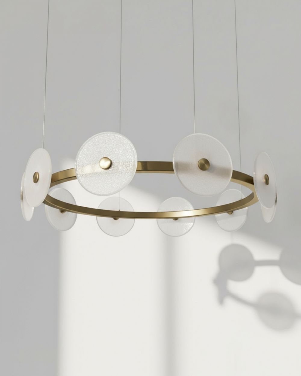 Лёгкость стеклянных дисков: Прозрачные матовые диски из стекла, подвешенные на почти невидимых тросах, создают иллюзию парящих в воздухе светящихся сфер. Они мягко рассеивают свет, добавляя освещению объём и мерцающую глубину.
