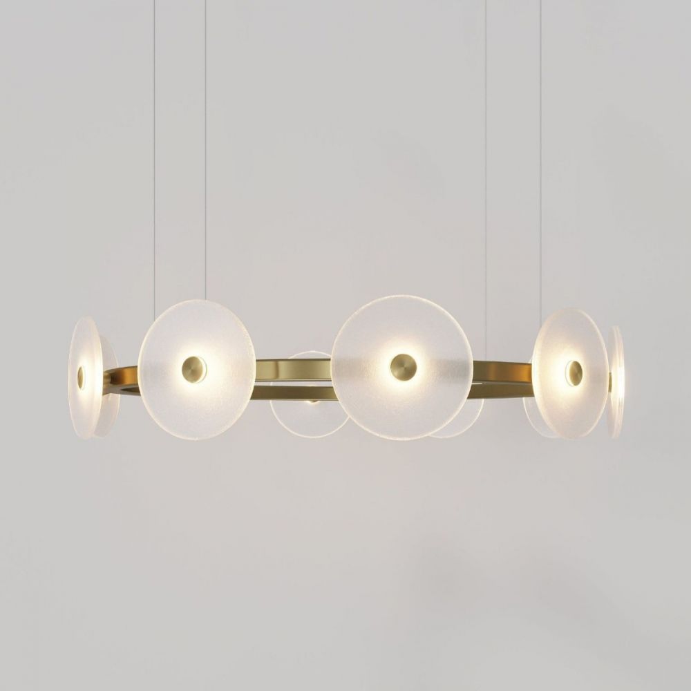 Золотая люстра «Милфорд» — это именно такое украшение. Её латунное кольцо и парящие стеклянные диски образуют лёгкую, почти невесомую композицию, которая наполняет комнату теплым сиянием и отблесками. Это современная трактовка гламура, где роскошь выражается не в массивности, а в точности линий и игре света.