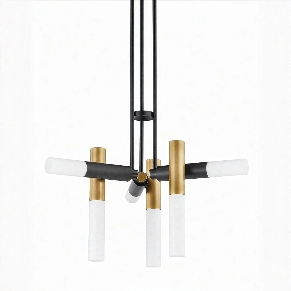 Строгие матовые плафоны: Шесть цилиндров из матового стекла высотой 35.5 см обеспечивают идеальное направленное вниз освещение. Они создают ровные световые колонны, минимизируя блики и давая комфортный для глаз свет, идеальный над обеденным столом или в гостиной.