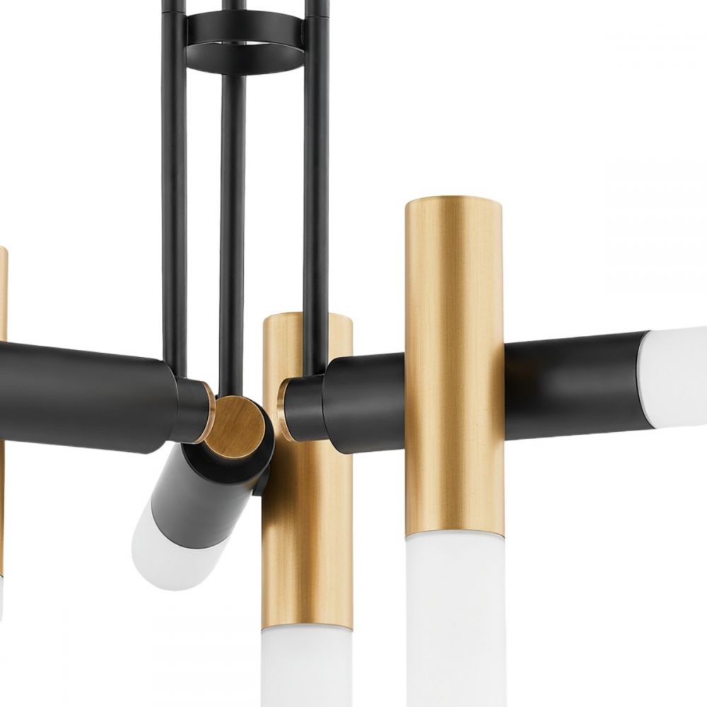 Тёплые акценты латуни: Гальваническое покрытие под латунь на элементах крепления и отделке вносит ноты благородного, неяркого блеска. Это тёплый контраст к чёрному, который смягчает общее восприятие и добавляет люстре дорогой, детализированный вид.