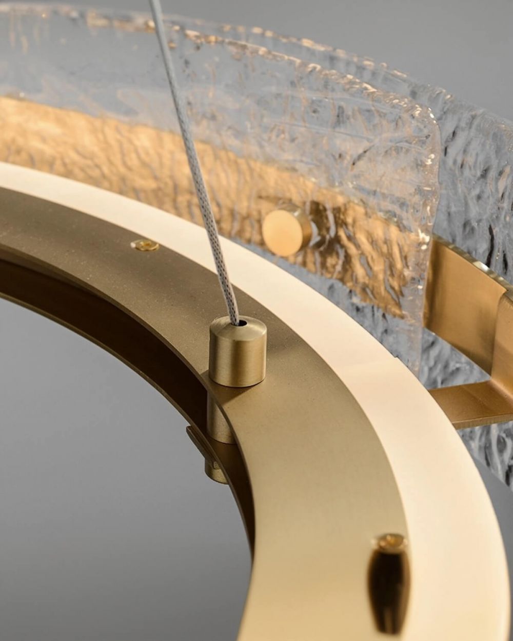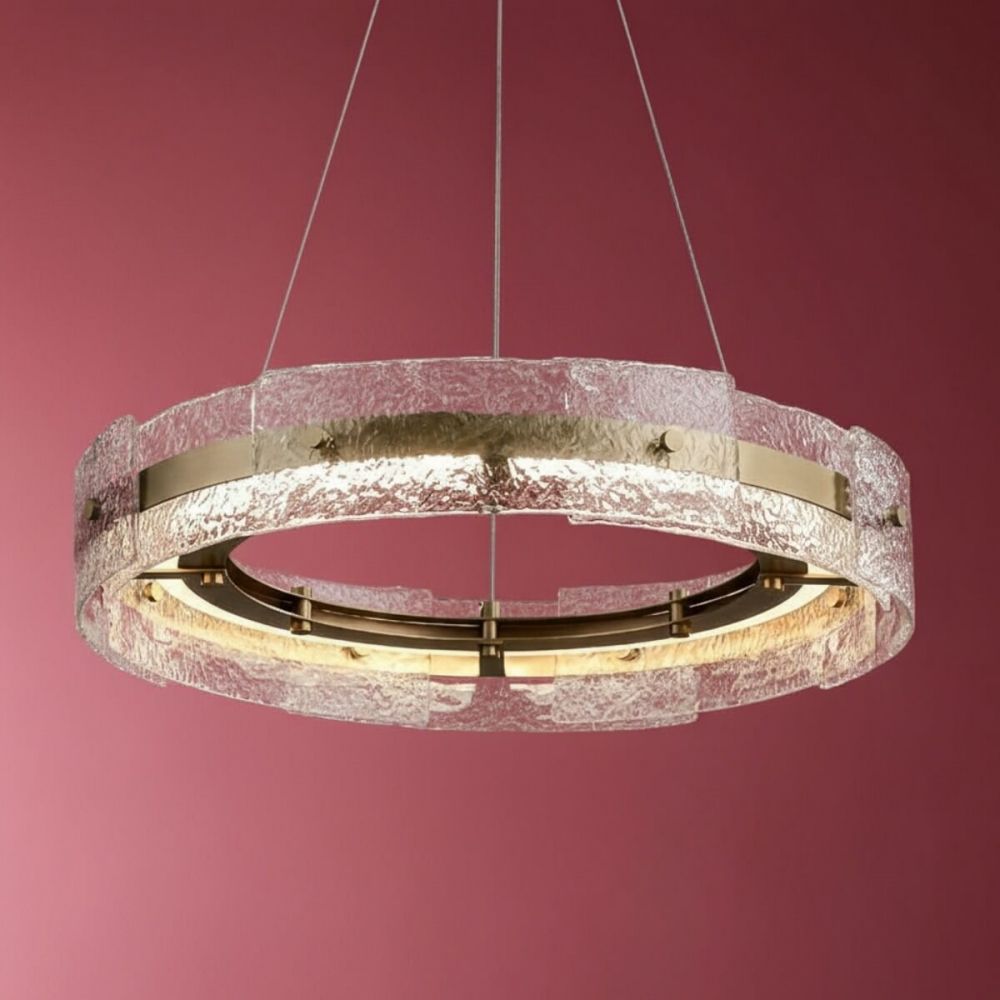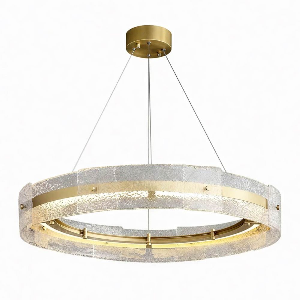 Мягкий кольцевой свет: Основной элемент — цельный матовый стеклянный рассеиватель кольцевой формы. Он полностью скрывает LED-источники, превращая люстру в объемный источник мягкого, равномерного, комфортного для глаз света, который красиво подчеркивает текстуры стен и мебели.