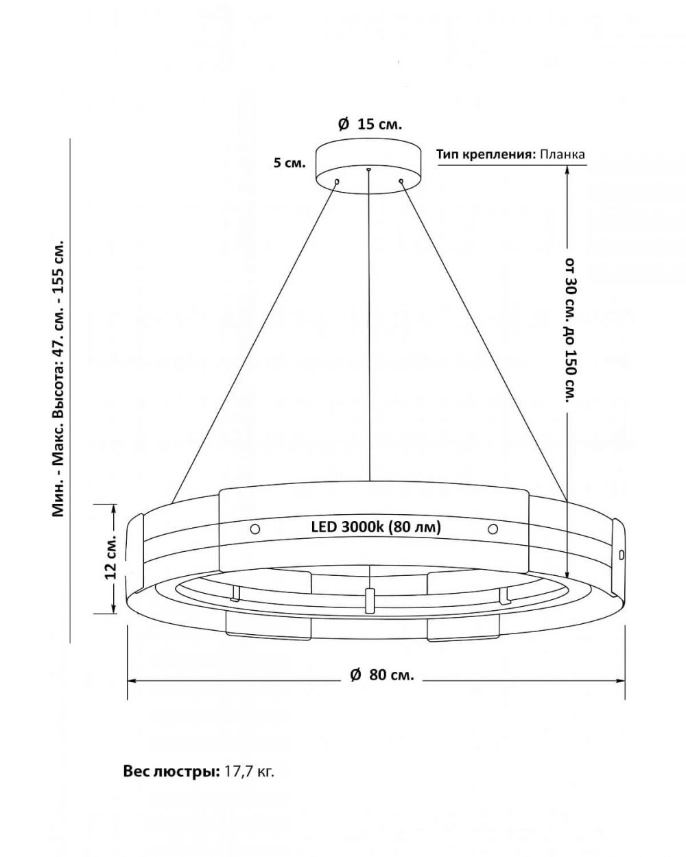 Четкая геометрия: Круг диаметром 80 см с минимальной высотой 12 см (без учета подвеса) — это идеальный выбор для помещений с разной высотой потолков. Люстра визуально не загромождает пространство, создавая при этом значимый световой акцент.