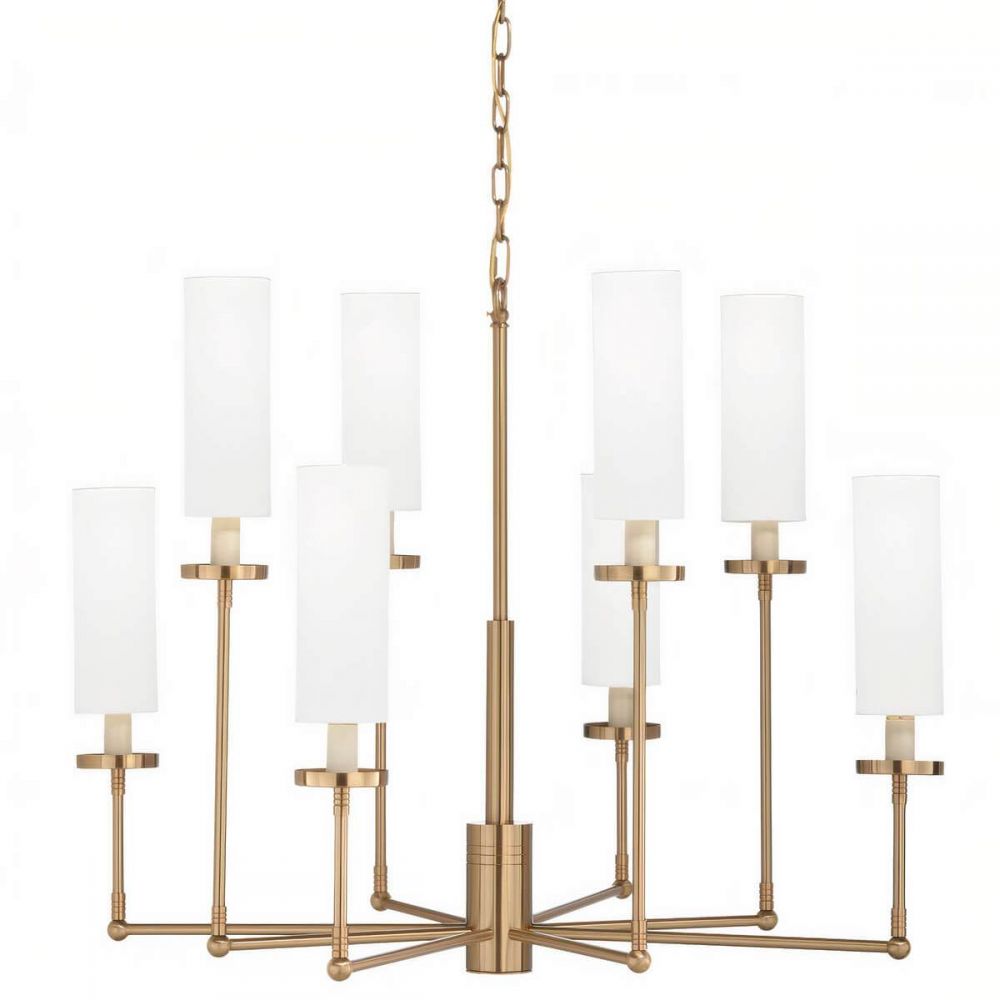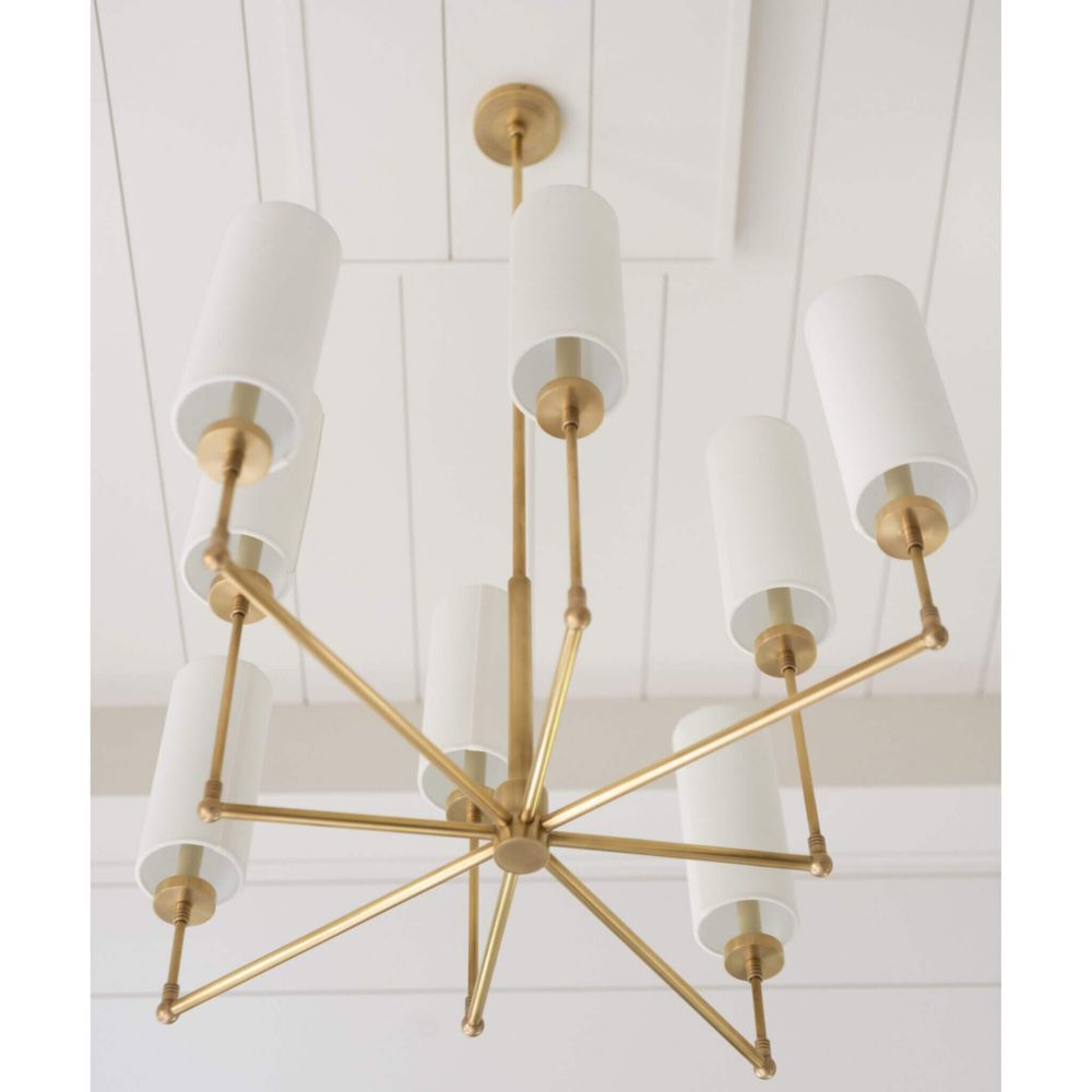 Золотая люстра «Новара» — это готовое парадное решение. Её двухуровневая конструкция, выполненная в благородном оттенке латуни, и восемь белых плафонов создают сложную, многослойную световую композицию. Это светильник для тех, кто ценит размах, праздничную атмосферу и безупречное качество исполнения.