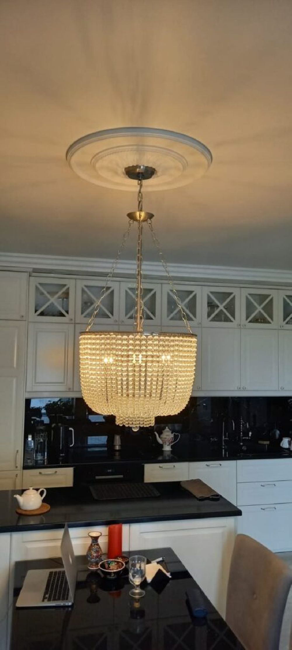 Искрящийся водопад из бусин: Каскадная конструкция, украшенная множеством прозрачных стеклянных бусин, является главным декоративным элементом. При включении света бусины ловят и мягко рассеивают лучи, создавая лёгкую, мерцающую дымку света вокруг люстры.