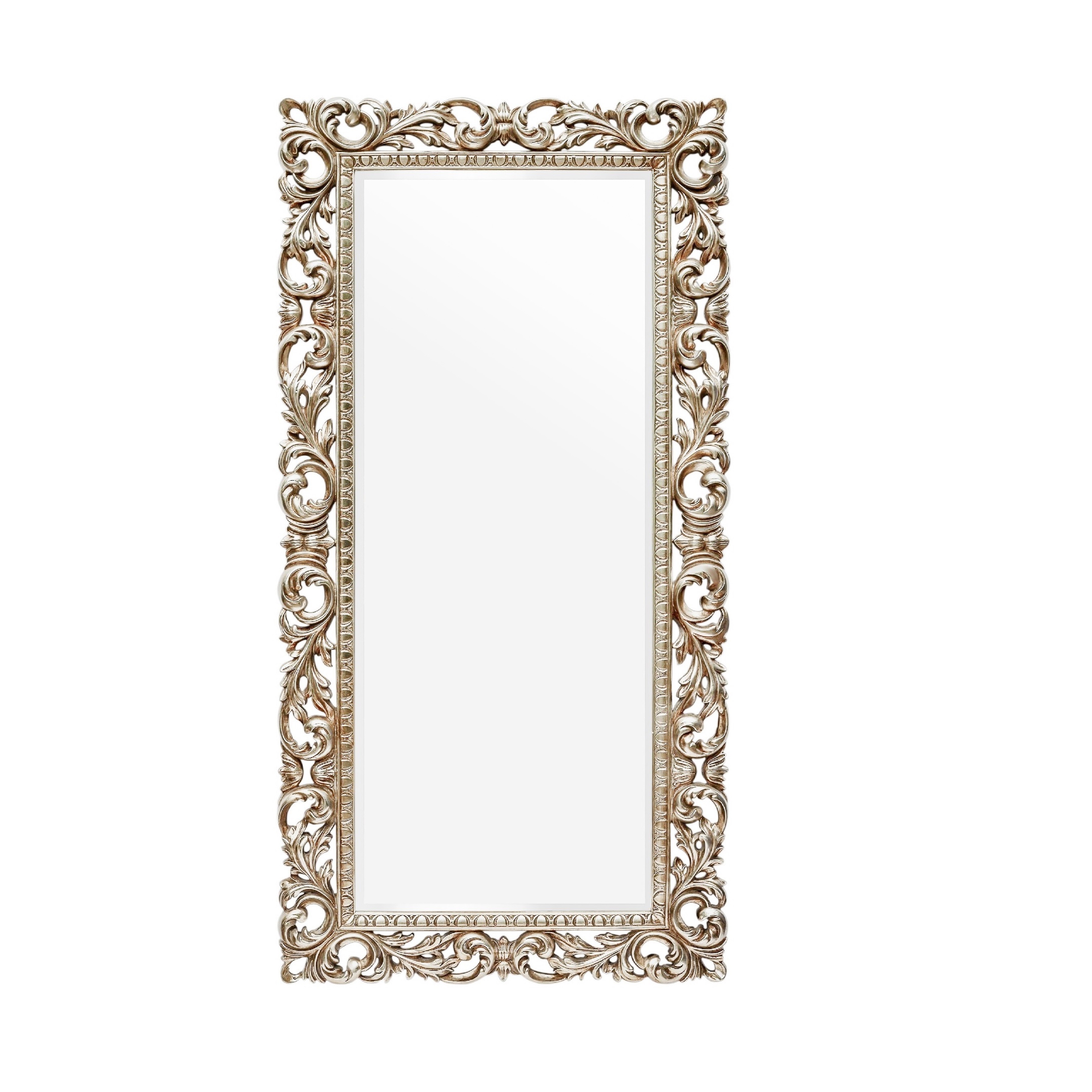 Напольное зеркало Kingsley Silver (Кингсли) размером 90×188 см — это полноценный ростовой формат. Высота 188 см позволяет увидеть себя в полный рост. Рама выполнена в богатом багетном стиле. Цвет — античное серебро с благородной холодной патиной.