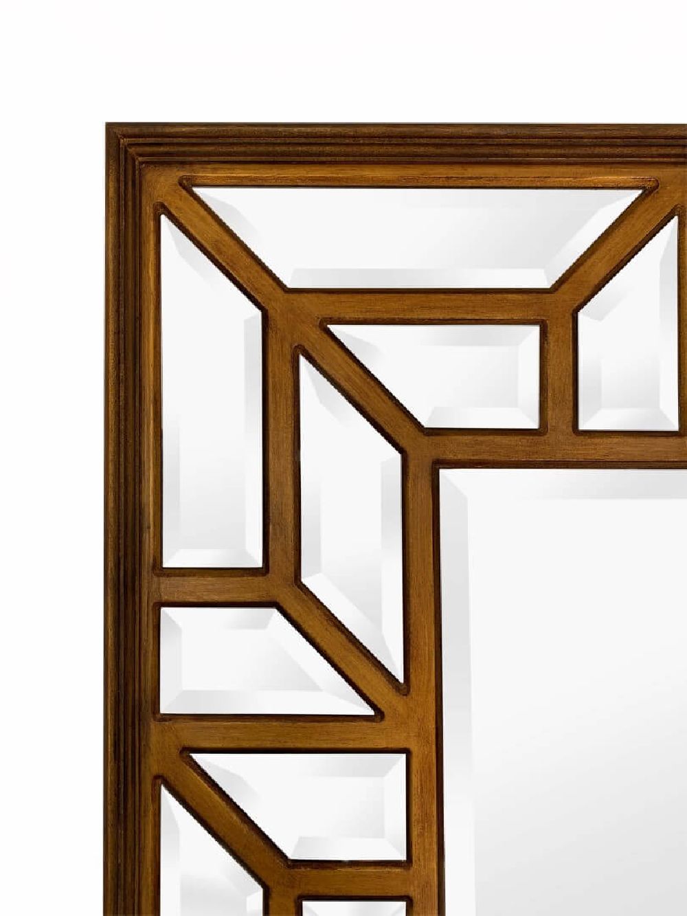 Главный акцент — геометричная рама, окрашенная в цвет «состаренное золото» . Эта техника придает ей благородный винтажный шарм и сложную фактуру . Каждый зеркальный элемент в самой раме имеет фацет (скошенную грань), который ловит и преломляет свет, наполняя пространство живым, мерцающим сиянием .