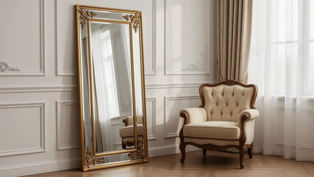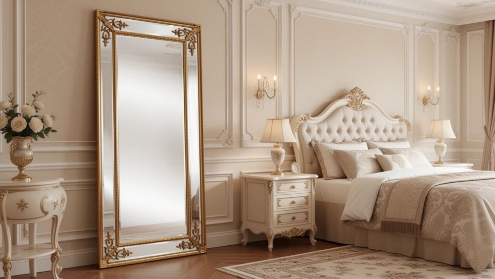 В спальне. Роскошное ростовое зеркало, добавляющее интерьеру благородства и величия.