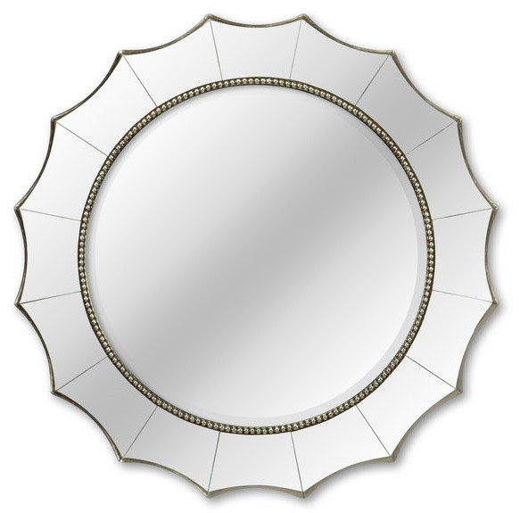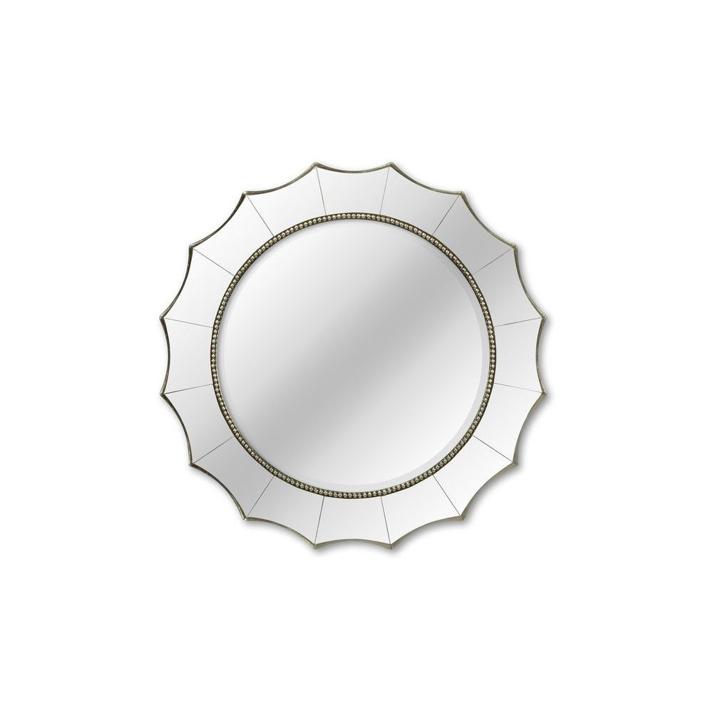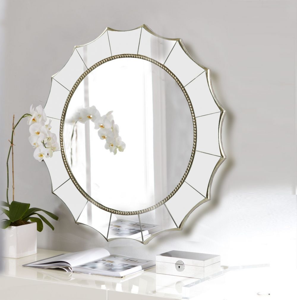 Диаметр зеркала без рамы — 56 см. Вес — 8,5 кг. Фацет добавляет игру света по краю, создавая бриллиантовое сияние. Материал зеркала — влагостойкое серебряное.