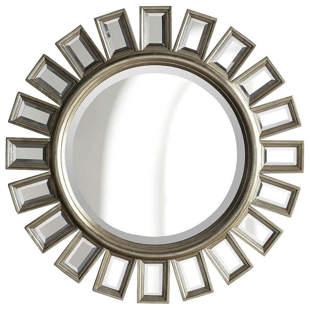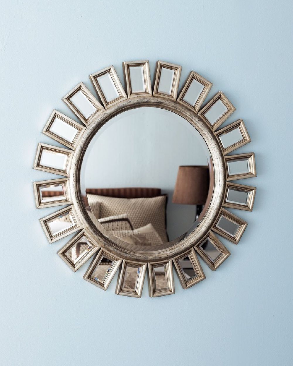 Зеркало солнце в серебряной раме “Эштон” – это зеркало имеет уникальный дизайн, состоящий из круглой рамы, окруженной множеством небольших прямоугольных зеркальных элементов. Эти элементы создают интересный визуальный эффект, придавая зеркалу особую привлекательность. Каждый зеркальный элемент обрамлен в серебряную деревянную оправу, которая придает зеркалу прочность и дополнительную изысканность. Зеркало идеально сочетает в себе современные и классические элементы декора, что делает его универсальным и подходящим для различных интерьеров. Размеры зеркала “Эштон” оптимальны для размещения на стене в гостиной, спальне, прихожей или любом другом помещении. Оно не только отражает свет и пространство, увеличивая визуально площадь, но и становится стильным акцентом, придающим шарм и изысканность вашему интерьеру.