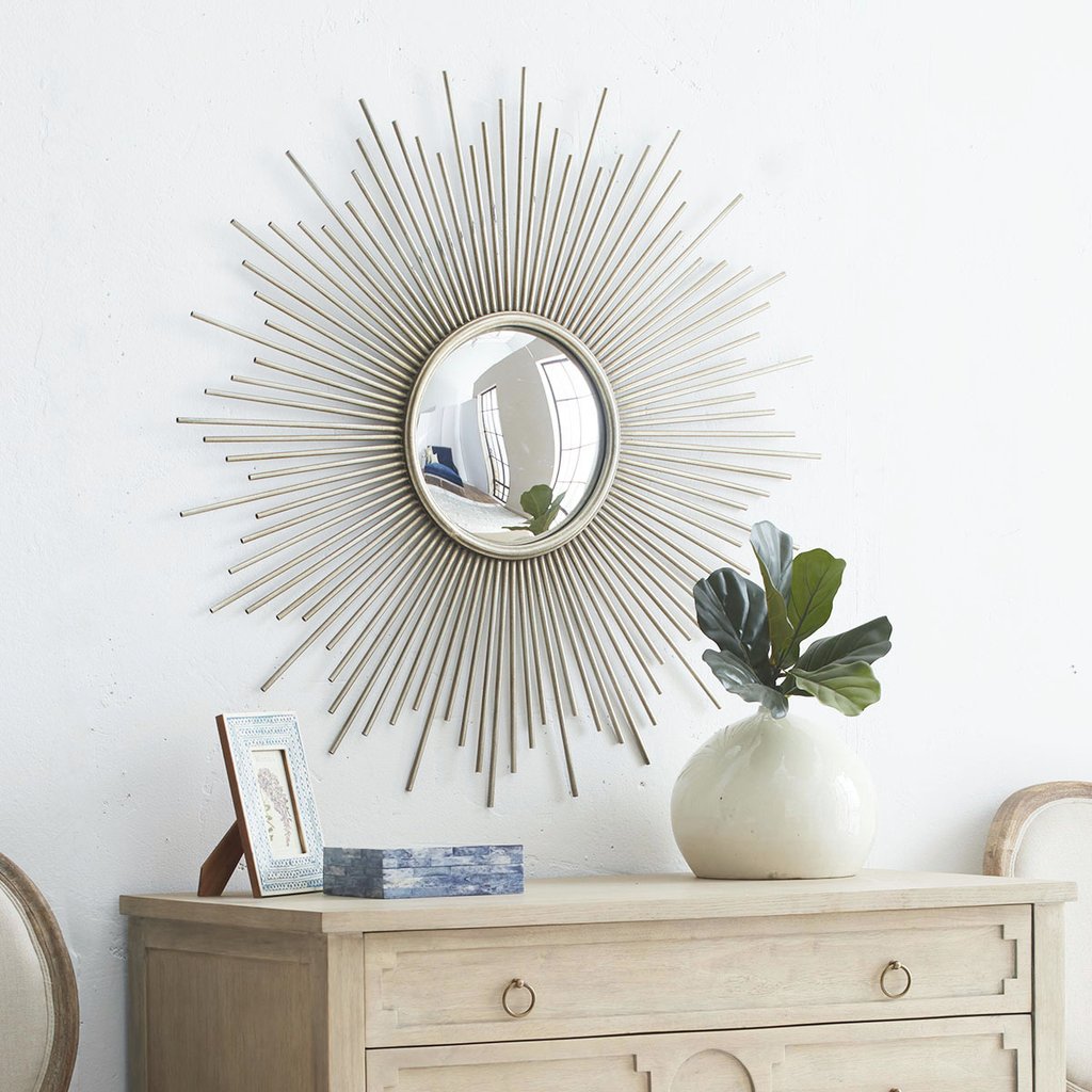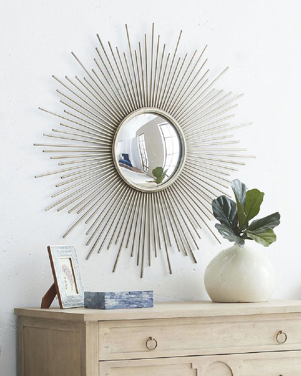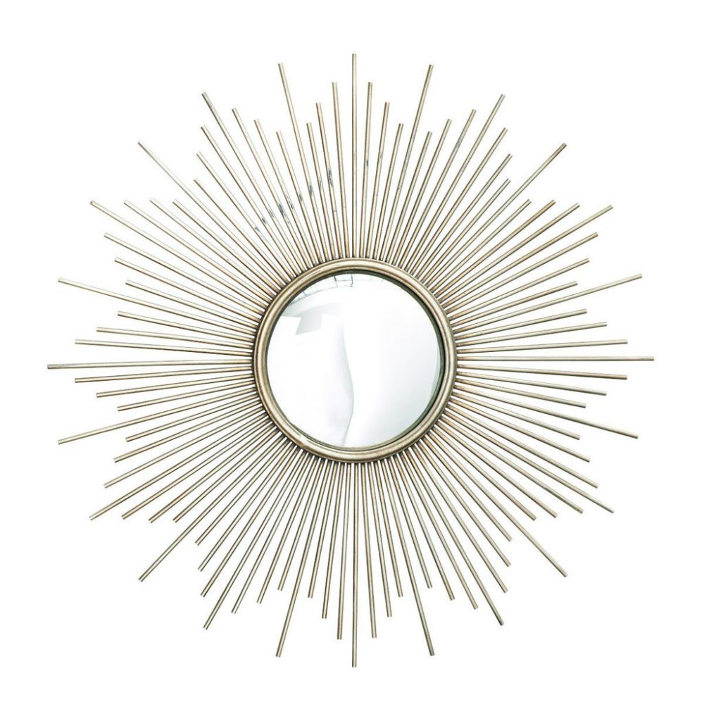 Серебряное зеркало-солнце “Брук” – это декоративное зеркало, которое станет прекрасным украшением вашего интерьера. Зеркало выполнено в стиле ар-деко, который привнесет элегантность и изысканность в любое помещение. Одной из особенностей этого зеркала является его эффект Fish-eye, или Рыбий глаз. Этот особый эффект создается за счет искажения изображения, которое отражается в зеркале. В результате этого удивительного эффекта, изображение приобретает оригинальную форму, напоминающую кривизну рыбьего глаза. Такое зеркало будет привлекать внимание и вызывать интерес у всех ваших гостей. Зеркало в форме солнца, окруженное серебристыми лучами, сразу же привлекает взгляд своей яркостью и необычностью!