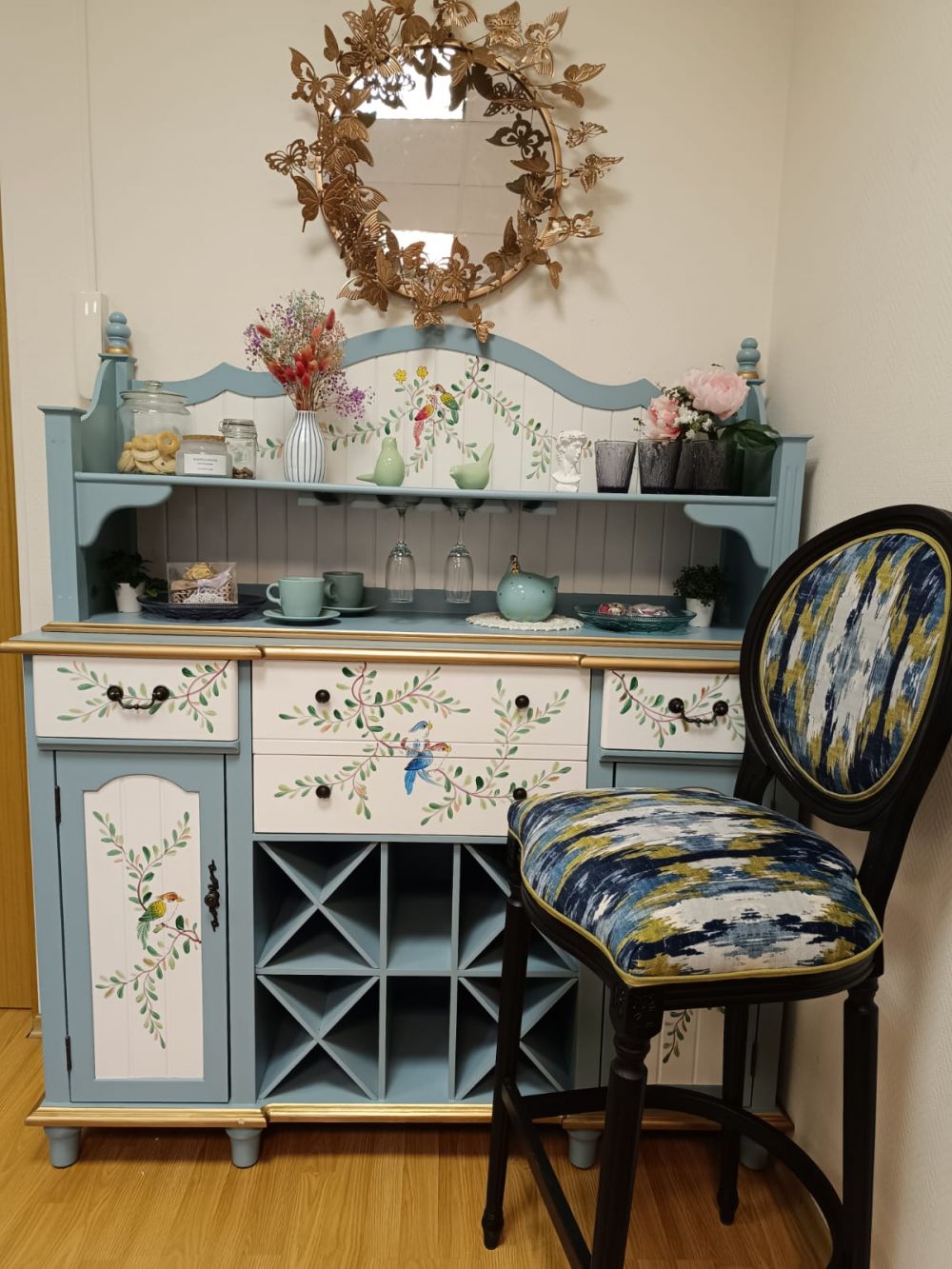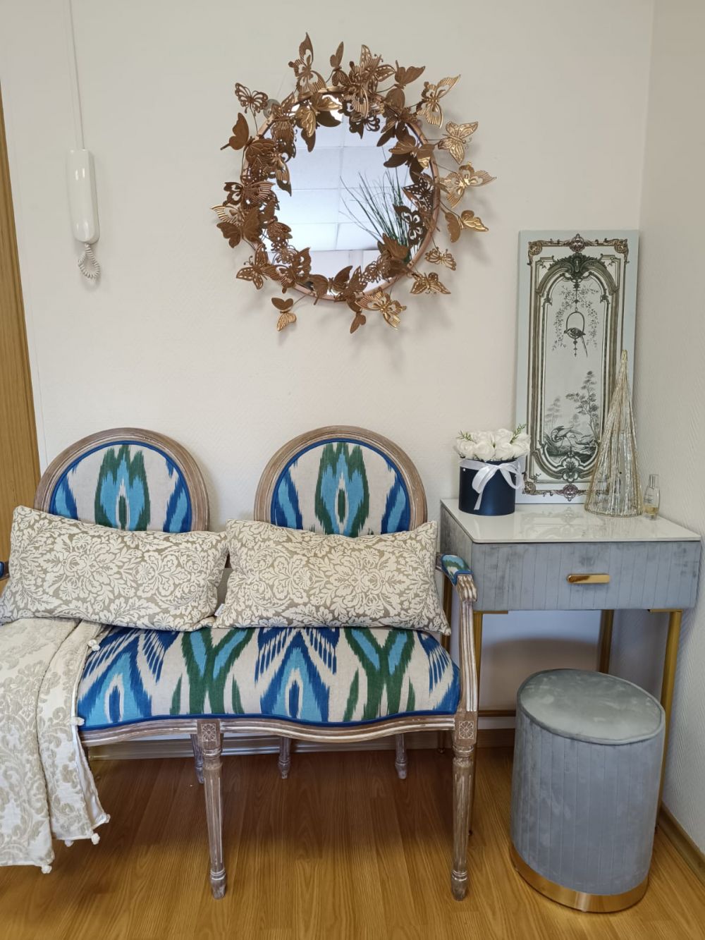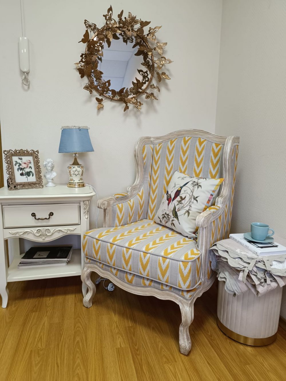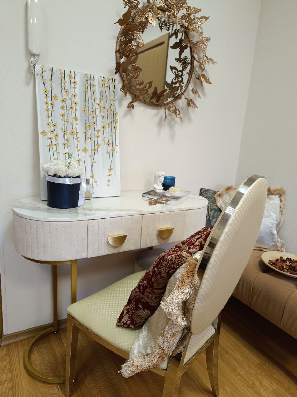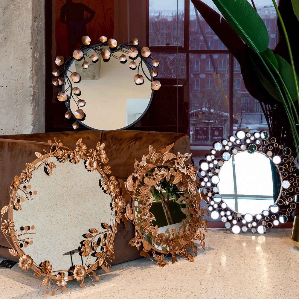 Зеркало служит не только для отражения, но и как сильный эмоциональный акцент. Символика бабочки и благородный золотой цвет создают в помещении особенную, светлую атмосферу, демонстрируя тонкий вкус владельцев.