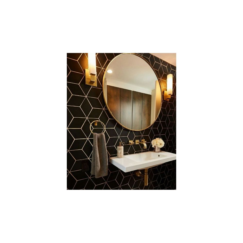 Золото – цвет, который работает в любом интерьере, если с ним не переборщить. Тонкая рама – идеальный баланс: она заметна, но не перетягивает внимание на себя, позволяя зеркальному полотну быть главным. А влагостойкое покрытие открывает возможность разместить такую роскошь даже в ванной.