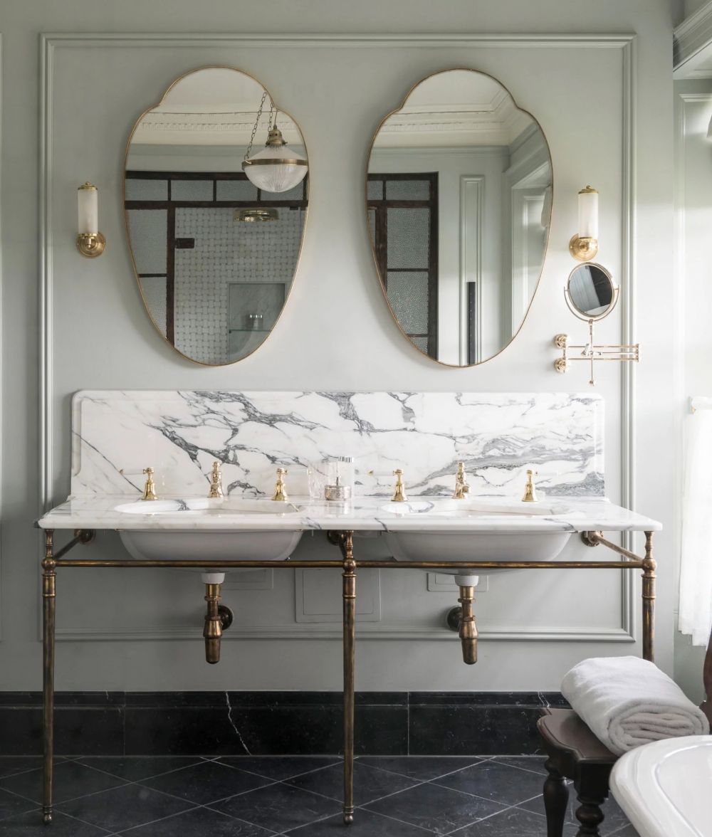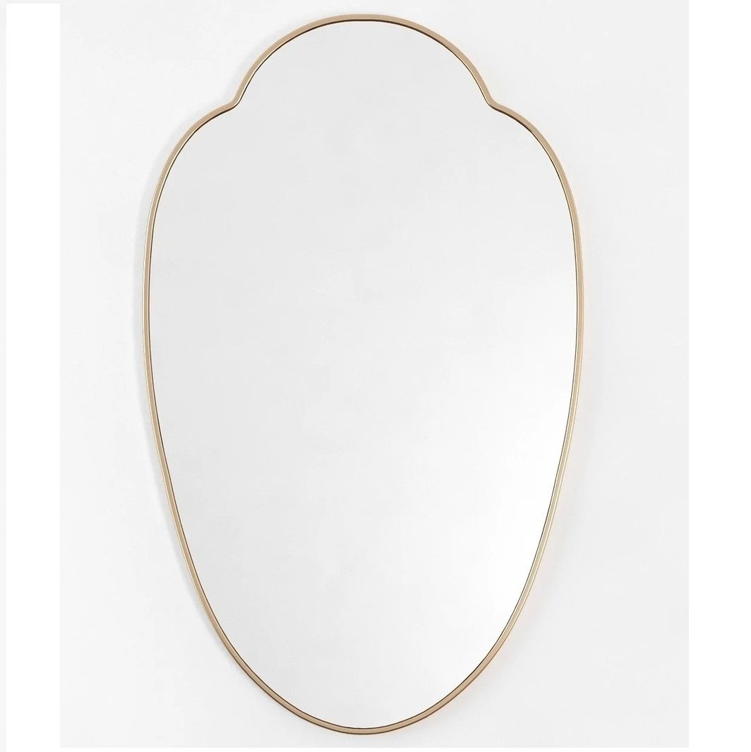 Фигурная форма и тонкая рама – идеальное решение. Они придают зеркалу характер, не перегружая композицию. Золотой цвет добавляет ноту тепла и благородства, не требуя сложного сочетания с остальным интерьером.