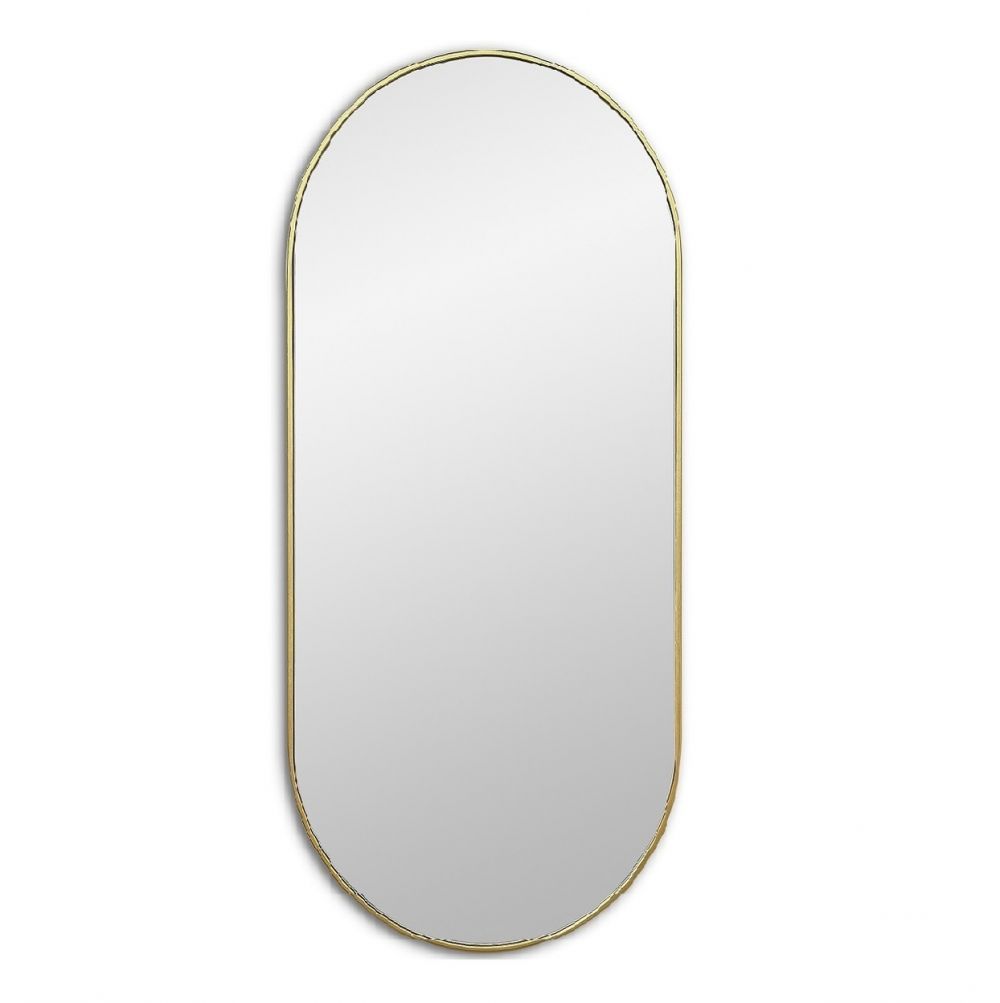 Зеркало Kapsel S размером 40х85 см — это случай, когда форма работает на пространство. Узкое, вытянутое овальное зеркало в тонкой золотой раме решает сразу несколько задач. Оно не загромождает стену, но при этом дает достаточно вертикальной площади, чтобы оценить образ в полный рост (если разместить вертикально) или зонировать пространство (если горизонтально).