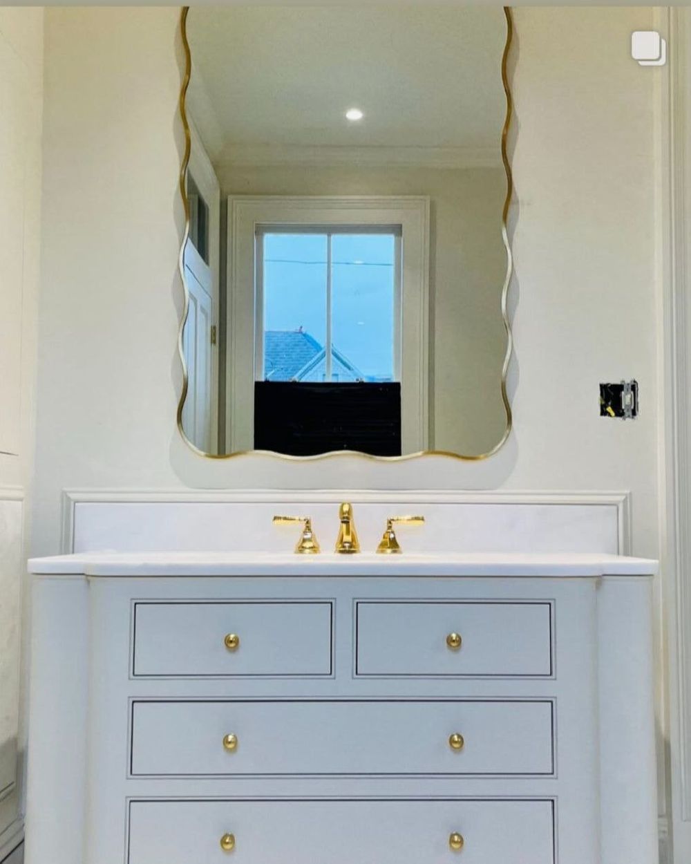 Тонкая рама и фигурная форма – идеальное решение. Они придают зеркалу легкость и характер, делая его заметным акцентом, но не утяжеляя пространство. Золото добавляет ноту тепла и статусности, подчеркивая изящество формы.