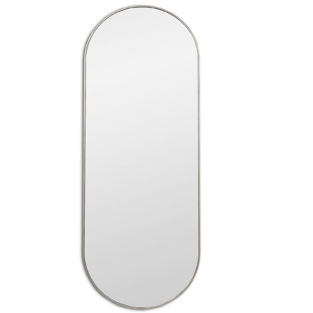 Серебряная рама здесь работает как сдержанный, благородный акцент. Тонкий деревянный профиль обрамляет вытянутое овальное полотно, подчеркивая его изящество. Несмотря на внушительную длину, зеркало сохраняет воздушность, органично вписываясь в интерьеры с холодной и нейтральной гаммой.