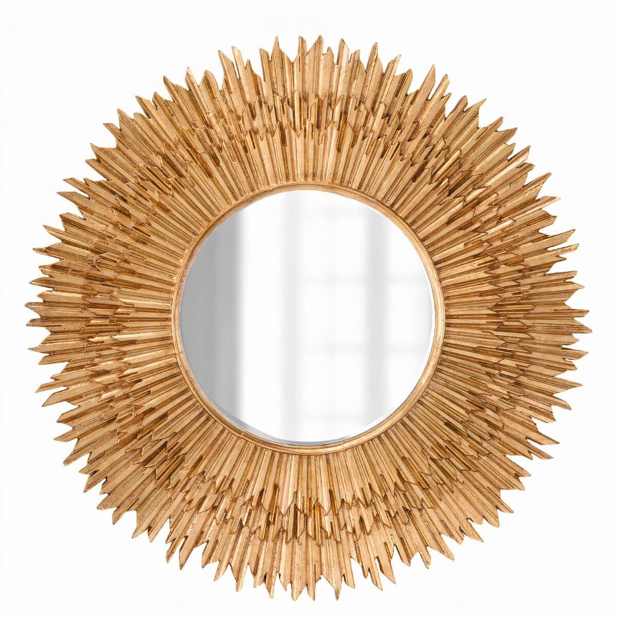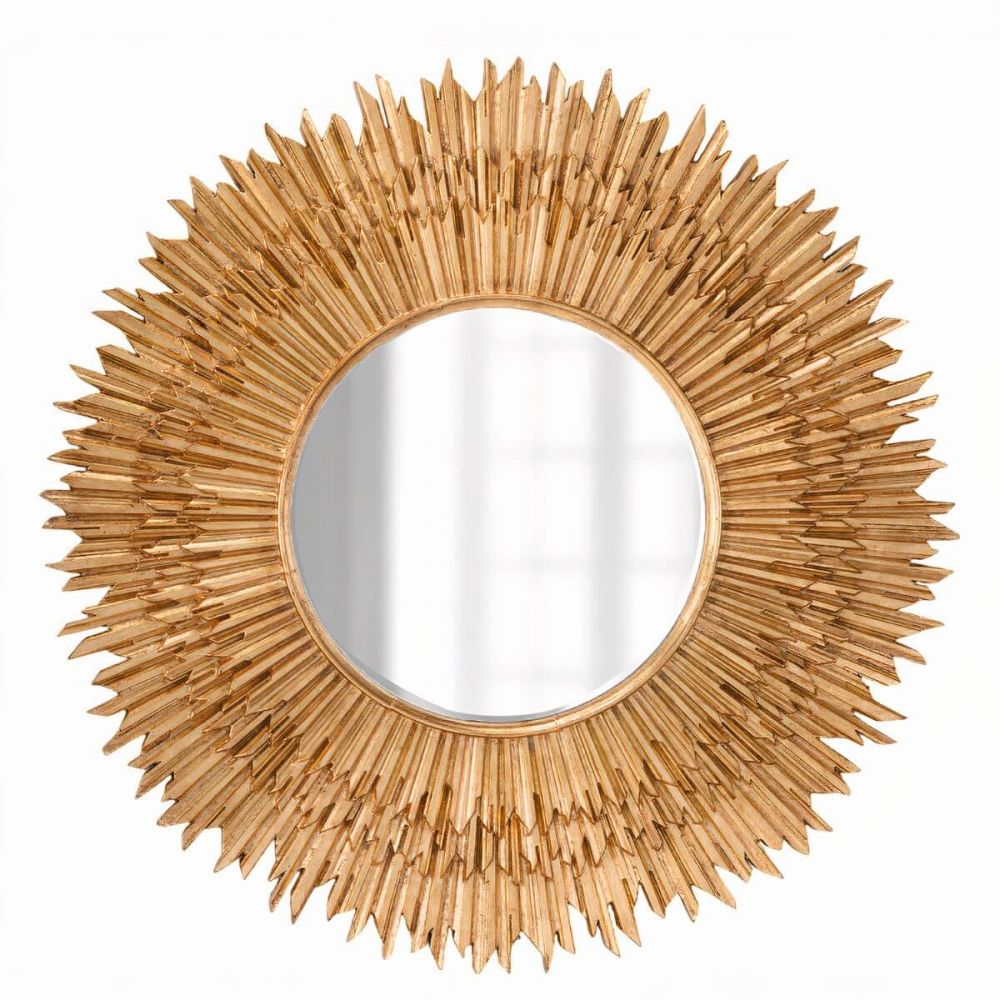 Зеркало «Гренье» — это величественное солнце диаметром метр, усыпанное золотом. Его уникальность — в аутентичной технике покрытия деревянных лучей сусальным золотом (поталью), создающей живое, мерцающее сияние, недоступное обычной краске. Это выбор для тех, кто не признаёт компромиссов в красоте.