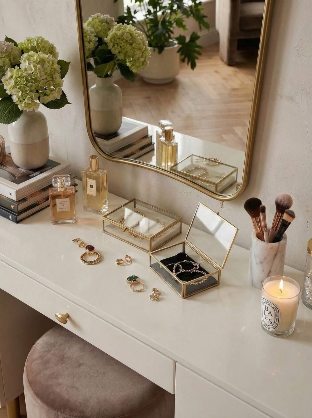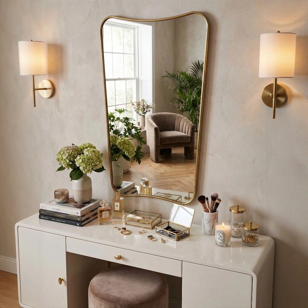 Золотая рама здесь работает как теплый, благородный акцент. Это не кричащий блеск, а мягкое, мерцающее обрамление, которое наполняет интерьер светом. Тонкий деревянный профиль подчеркивает изящную геометрию зеркала, не перегружая его.