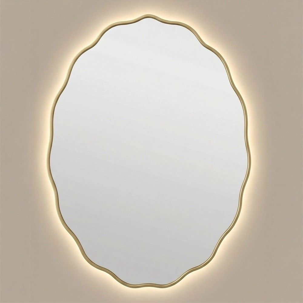 Зеркало Fancy Овал LED Gold (Фантазия) размером 60×80 см — это изящная овальная форма с фигурными волнообразными краями. Рама из натурального дерева покрыта золотом — тёплым, благородным. Край зеркала — полировка.