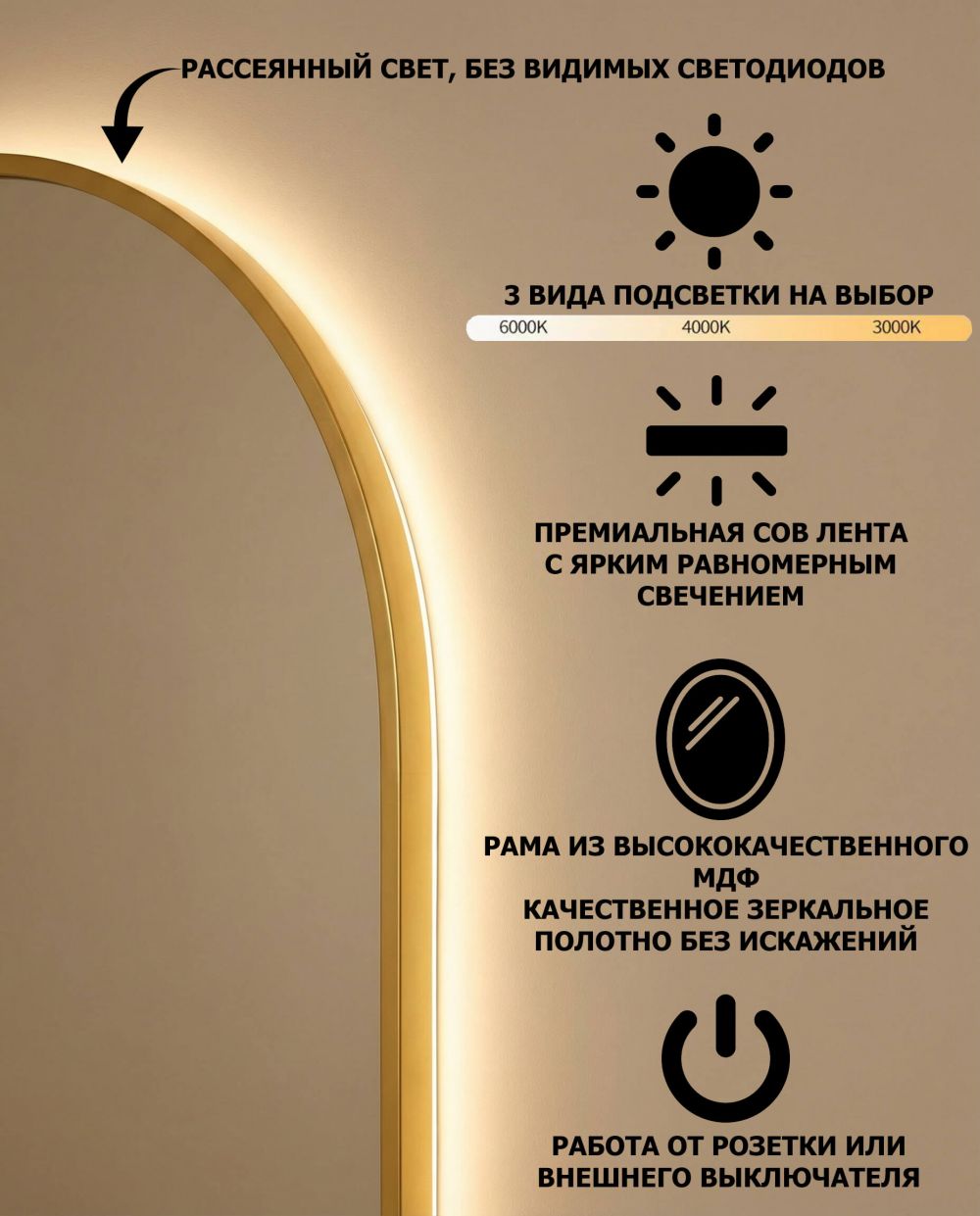 Подсветка: LED COB-лента 12V (3000K/4000K/6000K на выбор)