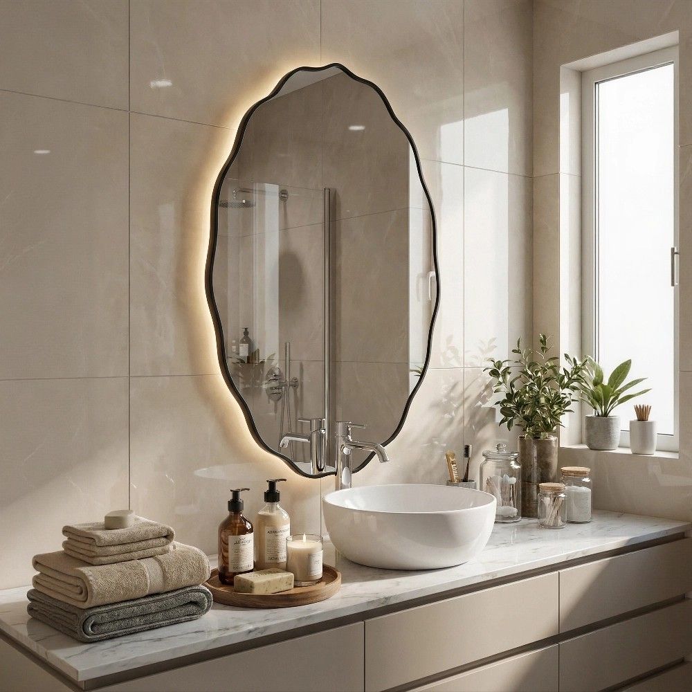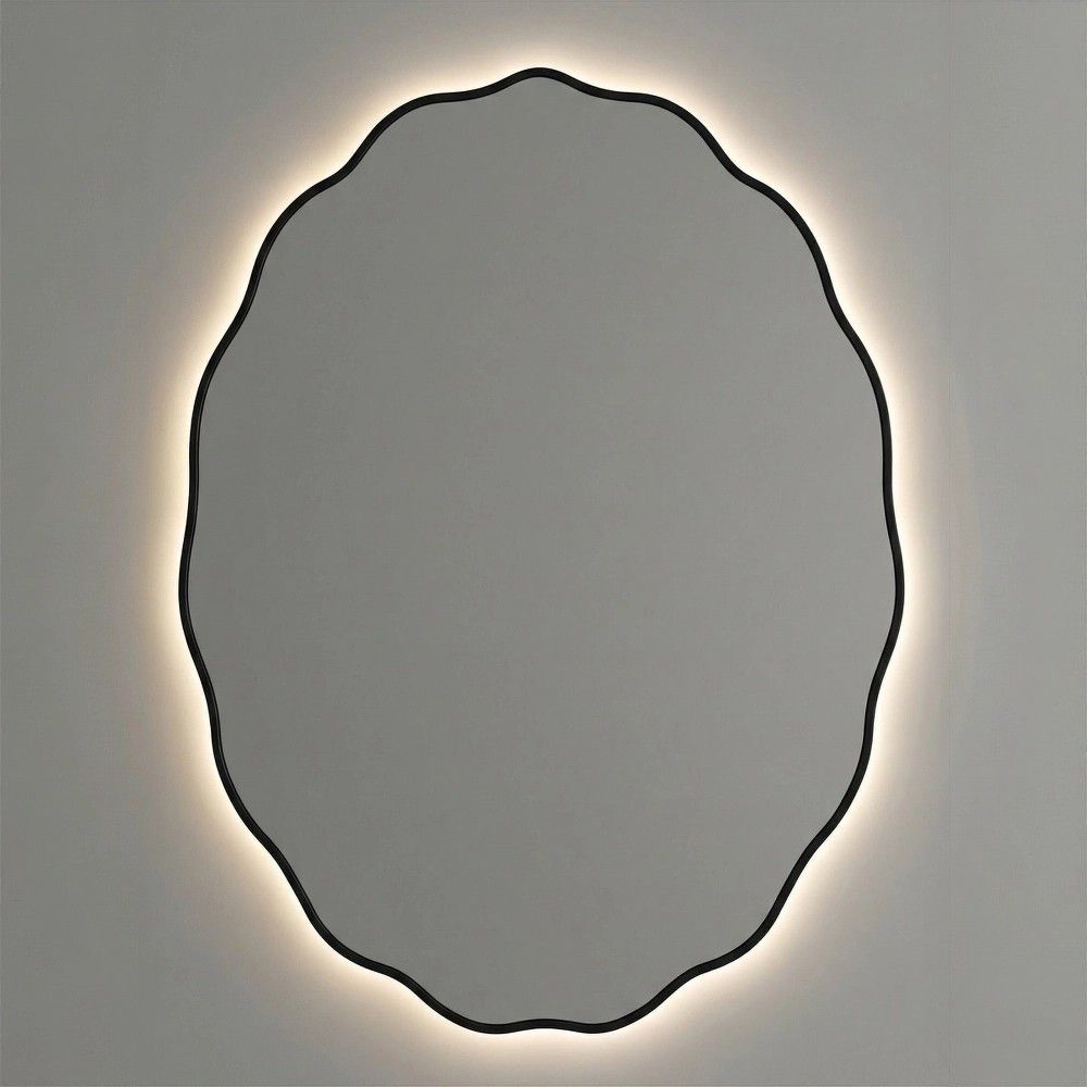 Вы ищете зеркало не круглое и не прямоугольное, а овальное — более мягкое, изящное. С фигурными волнообразными краями, чтобы оно выделялось среди стандартных моделей. И обязательно с подсветкой. Но золото и серебро не подходят — интерьер требует чёрной матовой графики. Плюс важно, чтобы зеркало можно было повесить и вертикально, и горизонтально.