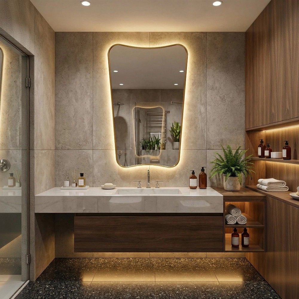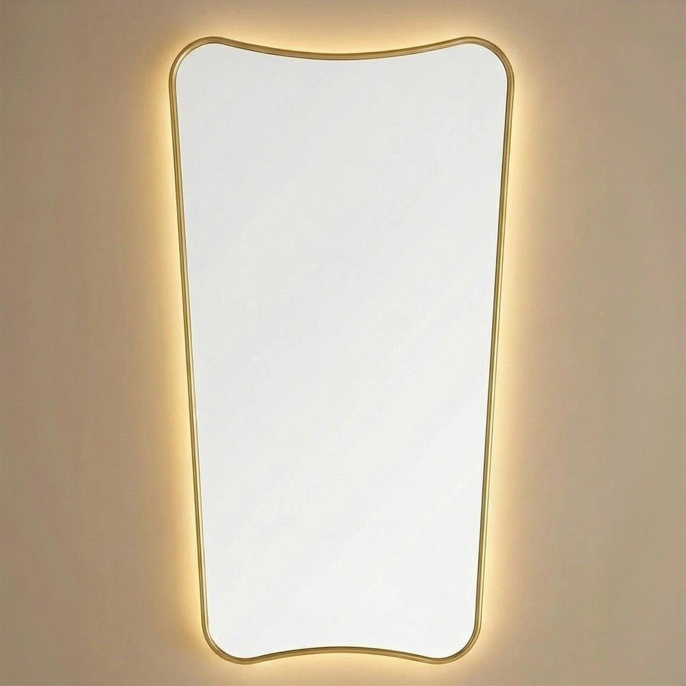 Высокое фигурное зеркало Sky L с золотой деревянной рамой и COB подсветкой. Влагостойкое, 3000K-6000K. Ростомер для всей семьи. Доставка по РФ.