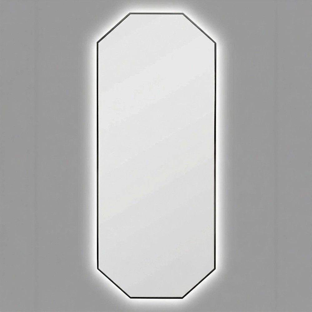 Внешний размер с рамой: 50 x 120 см. Форма: восьмиугольник. Рама: дерево, чёрный матовый. Зеркальное полотно: влагостойкое, серебряное, без фацета. Крепление: универсальное (вертикальное/горизонтальное). Подсветка: LED COB, 12V, три температуры свечения на выбор. Опционально: сенсорный диммер.