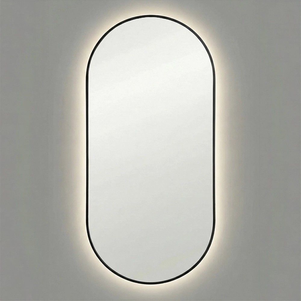 Овальная форма «капсула» в чёрной матовой раме. Мягкая геометрия смягчает строгость чёрного цвета. Нет ни одного острого угла — только плавные линии. Это зеркало не конкурирует с интерьером, а завершает его.