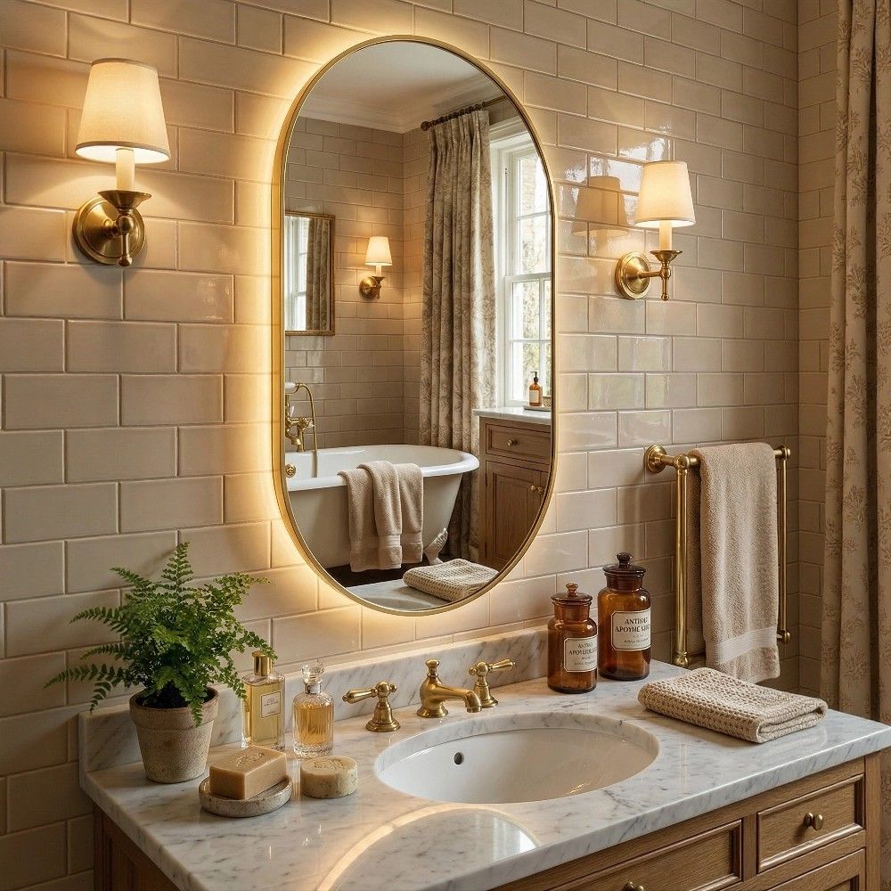 Овальная форма «капсула» смягчает геометрию помещения. Нет острых углов — нет визуального напряжения. Такое зеркало вписывается и в классическую ванную, и в современный минимализм, и в стиль ар-деко.
