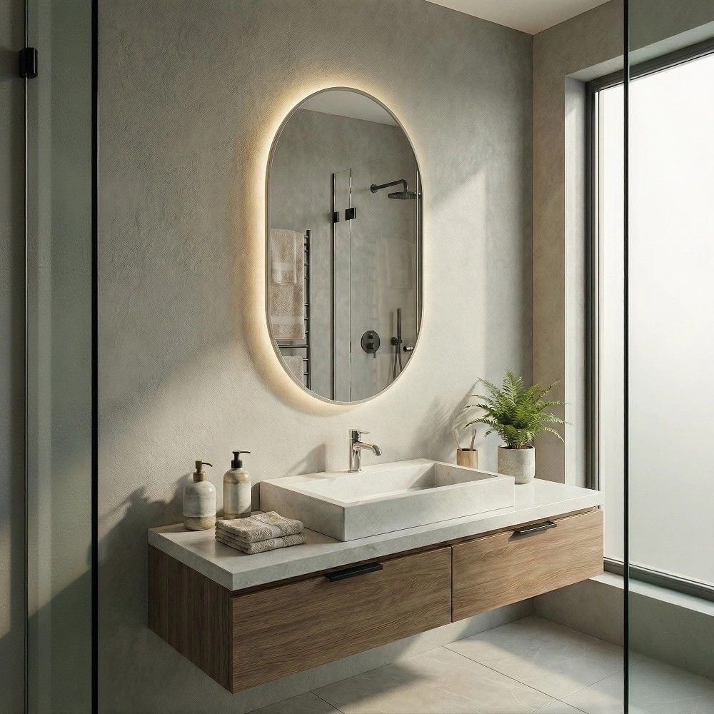 Овал «капсула» не имеет острых углов. Он мягко вписывается в любое пространство, не давит, не режет глаз. Такое зеркало визуально расширяет помещение, не перегружая его.
