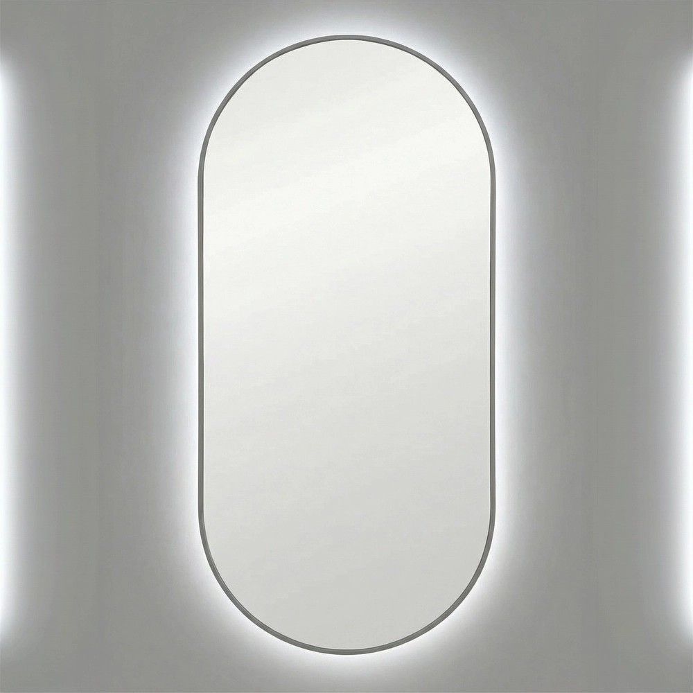 Размер внешний с рамой: 45 x 95 см. Форма: овальная (капсула). Рама: дерево, цвет серебро матовое. Зеркальное полотно: влагостойкое, серебряное, без фацета. Тип навески: универсальный (вертикальный или горизонтальный). Подсветка: LED COB, 12V, три температуры свечения на выбор. Защита блока питания: IP67. Опционально: сенсорный диммер с подсветкой.
