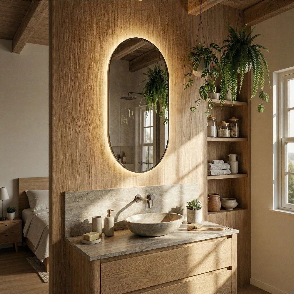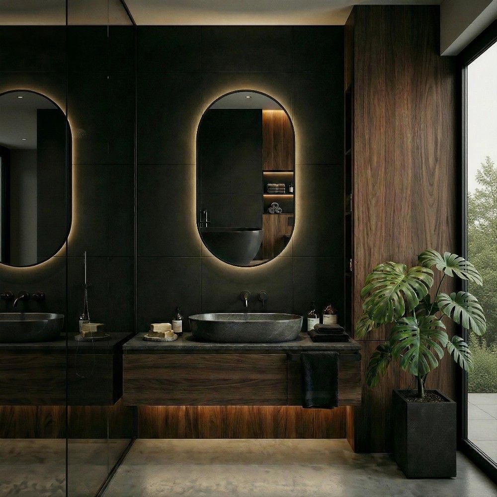 Вы видите себя по пояс и ниже — не нужно отходить назад. Рама из дерева с глубоким чёрным матовым покрытием не собирает отпечатки пальцев. Овальная форма без острых углов визуально расширяет помещение и безопасна для детей. Внутри — влагостойкое серебряное зеркало, которое не темнеет от пара годами.