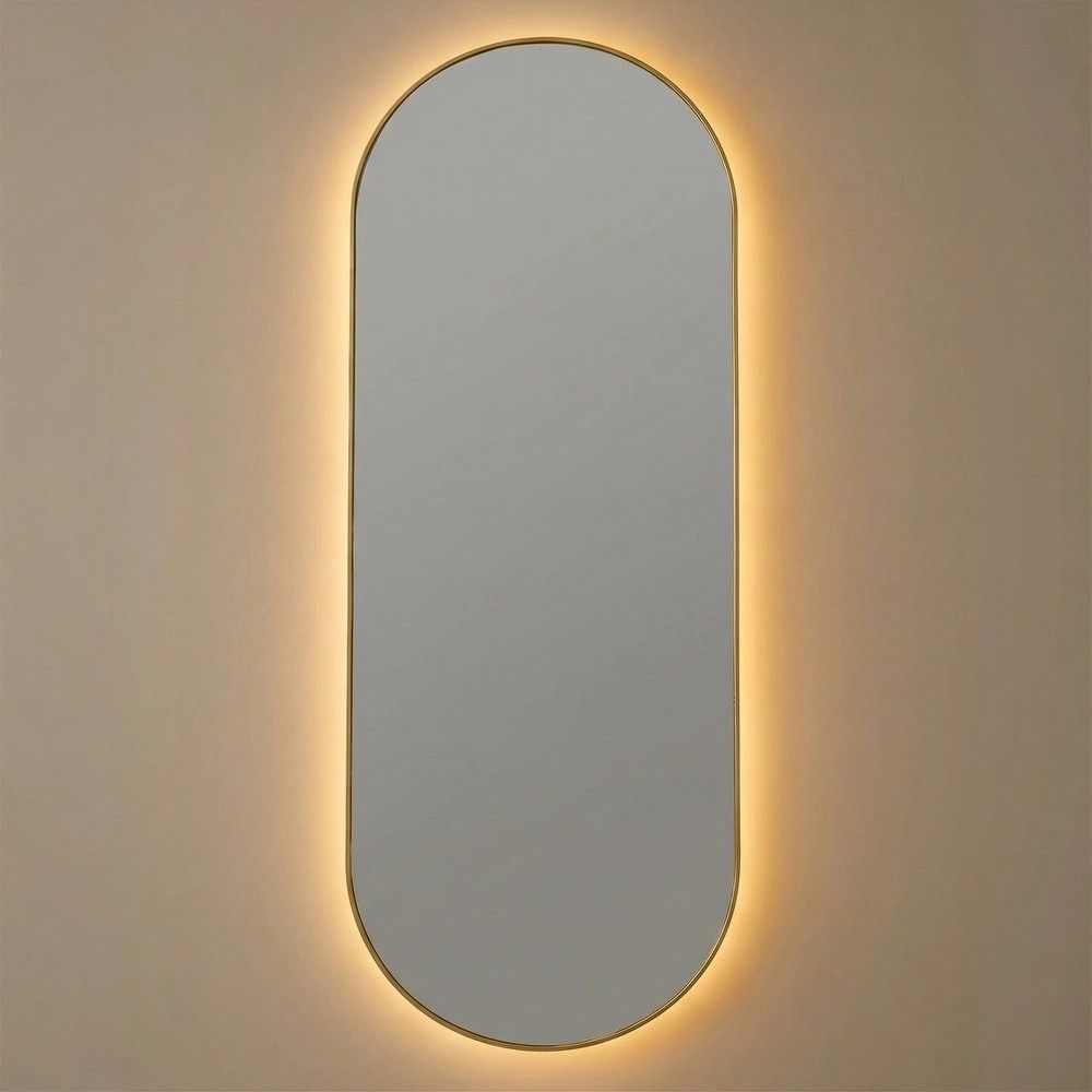 В просторной ванной или гардеробной маленькое зеркало теряется. Вы не видите себя в полный рост, приходится отходить назад. Зеркало Капсула L LED Gold — увеличенный овальный формат 50x135 см. Вы видите себя с головы до пят. Идеально для примерки одежды и семейной ванной.